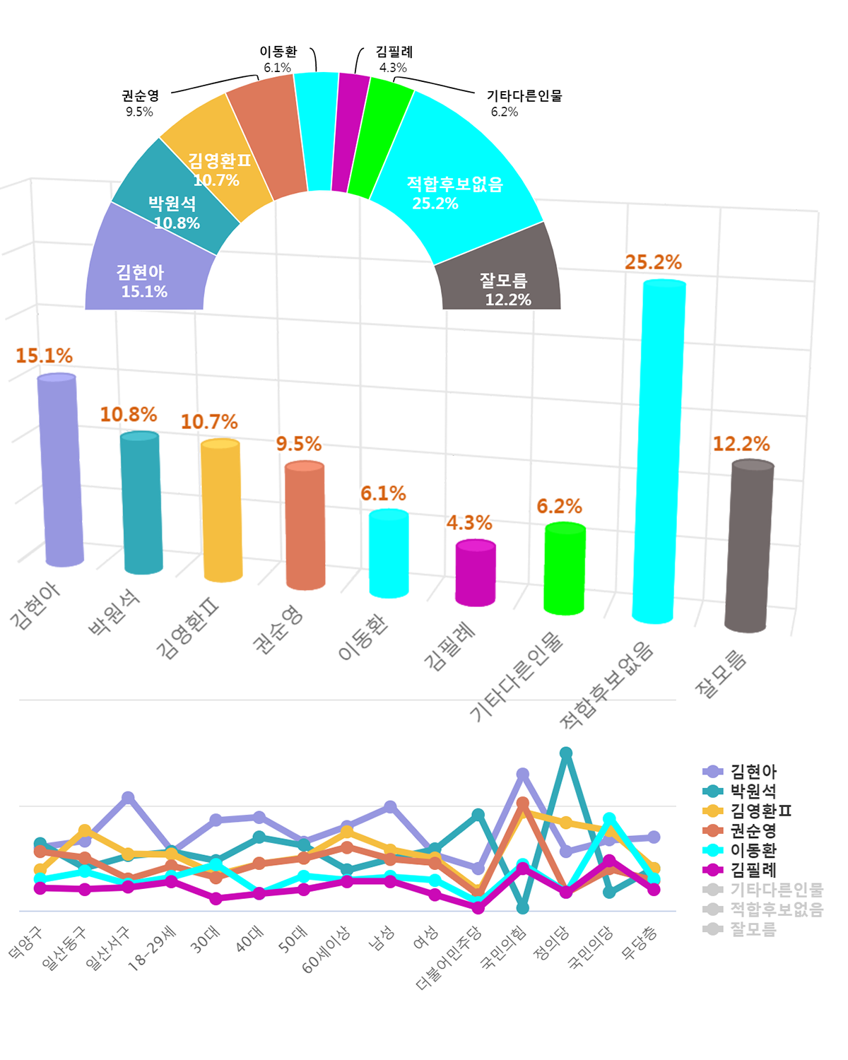 ¡¸±¹¹ÎÀÇÈû-¾ß±Ç °í¾ç½ÃÀå Èĺ¸ ÀûÇÕµµ¡¹´Â ±èÇö¾Æ Àü ±¹¹ÎÀÇÈû ±¹È¸ÀÇ¿øÀÌ 15.1%¸¦ ¾ò¾î 10.8%¸¦ ¾òÀº ¹Ú¿ø¼® Àü Á¤ÀÇ´ç ±¹È¸ÀÇ¿ø°ú 4.3%Æ÷ÀÎÆ® Â÷ÀÌ·Î ÃÊÁ¢ÀüÀ» ¹úÀÌ´Â °ÍÀ¸·Î ³ª¿Ô´Ù. ÀÌ¾î ±è¿µÈ¯¥± ±¹¹ÎÀÇÈû °í¾ç½Ãº´ ´çÇùÀ§¿øÀåÀº 10.7%·Î 3À§¸¦, ±Ç¼ø¿µ ±¹¹ÎÀÇÈû °í¾ç½Ã°© ´çÇùÀ§¿øÀåÀº 9.5%·Î 4À§¸¦, À̵¿È¯ Àü ±¹¹ÎÀÇÈû °í¾ç½Ãº´´çÇùÀ§¿øÀåÀº 6.1%·Î 5À§¸¦, ±èÇÊ·Ê ±¹¹ÎÀÇÈû °í¾ç½ÃÀ» ´çÇùÀ§¿øÀåÀº 4.3%·Î 6À§¸¦ ÇÏ´Â °ÍÀ¸·Î ±â·ÏµÇ¾ú´Ù. ¡¸ÀûÇÕÈĺ¸¾øÀ½¡¹25.2%,¡¸À߸𸧡¹12.2%,¡¸±âŸ´Ù¸¥Àι°¡¹6.2%,ÀÇ ÀÀ´äµµ ±â·ÏµÇ¾ú´Ù.