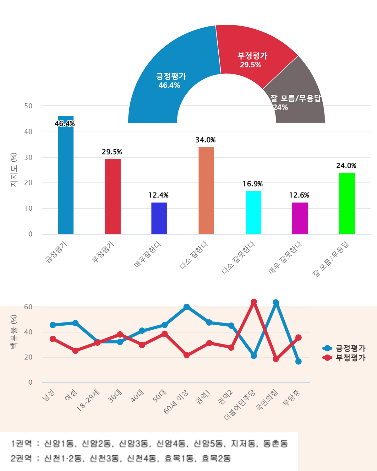¡¸±àÁ¤Æò°¡¡¹´Â "³²¼º" , "¿©¼º" , "40´ë" ¿¬·ÉÃþ, "60¼¼ ÀÌ»ó" ¿¬·ÉÃþ, "±Ç¿ª1" Áö¿ª, "±Ç¿ª2" Áö¿ª, "±¹¹ÎÀÇÈû" ÁöÁöÃþ¿¡¼ ¡¸ºÎÁ¤Æò°¡¡¹¸¦ 10%p ÀÌ»ó Å« Â÷ÀÌ·Î µûµ¹¸®¸ç ³ôÀº ÀÀ´äÀ» º¸¿´´Ù.