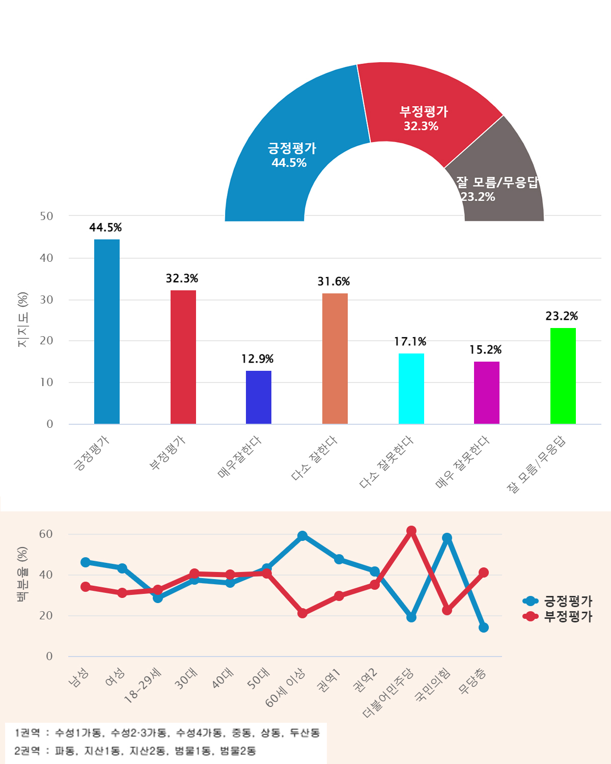 ¡Þ '±àÁ¤Æò°¡' 44.5%, 'ºÎÁ¤Æò°¡'(32.3%)º¸´Ù 12.2%p ´õ ³ô¾Æ