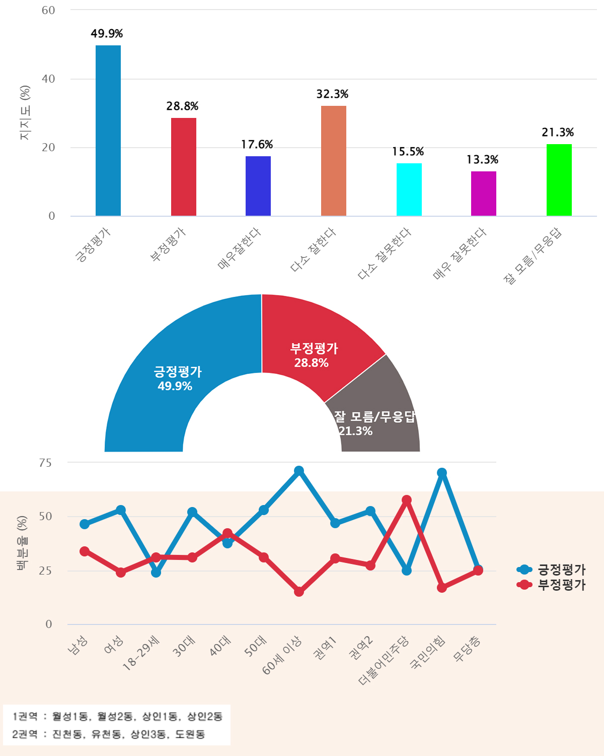 "±Ç¿ª1" Áö¿ªÀº ¡¸±àÁ¤Æò°¡¡¹46.7% > ¡¸ºÎÁ¤Æò°¡¡¹30.5% , "±Ç¿ª2" Áö¿ªÀº ¡¸±àÁ¤Æò°¡¡¹52.6% > ¡¸ºÎÁ¤Æò°¡¡¹27.3% ¼øÀ¸·Î ³ªÅ¸³µ´Ù.