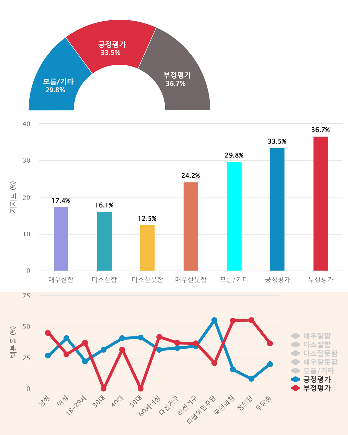 ¡¸±àÁ¤Æò°¡¡¹´Â ±¹¹ÎÀÇÈû ÁöÁöÃþ(62.8%), ³ª¼±°Å±¸ Áö¿ª(46.6%), ³²¼º (40.2%)°¡¼±°Å±¸ Áö¿ª(38%)¿¡¼­ ³ô¾Ò°í, ¡¸ºÎÁ¤Æò°¡¡¹´Â ´õºÒ¾î¹ÎÁÖ´ç ÁöÁöÃþ(52.1%), Á¤ÀÇ´ç ÁöÁöÃþ(45.2%), ¶ó¼±°Å±¸ Áö¿ª(44.1%), ¿©¼º (37.3%)¿¡¼­ »ó´ëÀûÀ¸·Î ³ô°Ô ³ªÅ¸³µ´Ù.