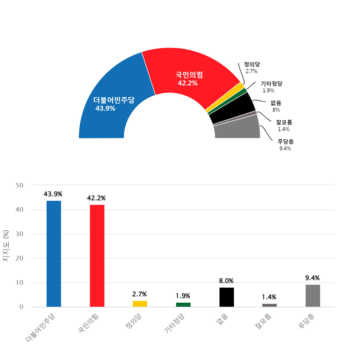 Á¤´çÁöÁöµµ¡¥´õºÒ¾î¹ÎÁÖ´ç 43.9%, ±¹¹ÎÀÇÈû 42.2%, ¹«´çÃþ 9.4%