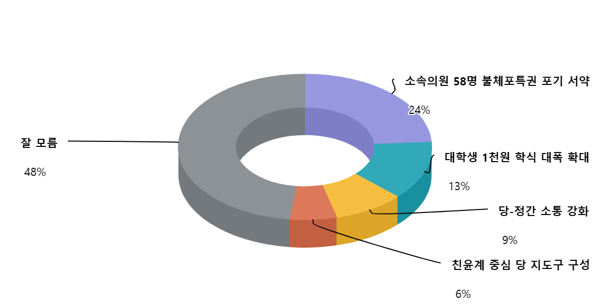 Á¶»ç±â°ü KOPRA°¡ 3¿ù 31ÀÏ¿¡¼­ 2ÀϱîÁö »çÈê°£ ½Ç½ÃÇÏ¿© 3ÀÏ ¹ßÇ¥ÇÑ ¡¸¿©´ç - ±¹¹ÎÀÇÈû ÀßÇÏ´Â Á¡¡¹¸¦ ¹¯´Â Á¶»ç¿¡¼­ ¡¸¼Ò¼ÓÀÇ¿ø 58¸í ºÒüÆ÷Ư±Ç Æ÷±â ¼­¾à¡¹ÀÌ 24%¸¦ ±â·ÏÇÏ¿© 2À§ ¡¸´ëÇлý 1õ¿ø ÇÐ½Ä ´ëÆø È®´ë¡¹(13%)¿¡ 11%p Â÷ÀÌ·Î ¾Õ¼­ ³ª°¡¸ç, µÚ¸¦ ÀÌ¾î ¡¸´ç-Á¤°£ ¼ÒÅë °­È­¡¹ÀÌ 9%, ¡¸Ä£À±°è Á᫐ ´ç Áöµµ±¸ ±¸¼º¡¹ÀÌ 6%¸¦ ÇÏ´Â °ÍÀ¸·Î ±â·ÏµÇ¾ú´Ù.