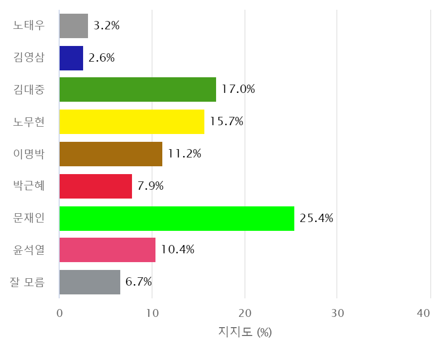 Á¶»ç±â°ü ¹Ìµð¾îÅ丶Åä°¡ 4¿ù 3ÀÏ¿¡¼ 5ÀϱîÁö »çÈê°£ ½Ç½ÃÇÏ¿© 7ÀÏ ¹ßÇ¥ÇÑ ¡¸¿ª´ë ´ëÅë·É ¿Ü±³¾Èº¸ Á¤Ã¥ Æò°¡¡¹¸¦ ¹¯´Â Á¶»ç¿¡¼ ¡¸¹®ÀçÀΡ¹Àü ´ëÅë·ÉÀÌ 25.4%¸¦ ±â·ÏÇÏ¿© 2À§ ¡¸±è´ëÁß¡¹(17%) 8.4%p Â÷ÀÌ·Î ¾Õ¼ ³ª°¡¸ç, µÚ¸¦ ÀÌ¾î ¡¸³ë¹«Çö¡¹ 15.7%, ¡¸À̸í¹Ú¡¹ 11.2%, ¡¸À±¼®¿¡¹ 10.4%, ¡¸¹Ú±ÙÇý¡¹ 7.9%, ¡¸³ëÅ¿졹 3.2%, ¡¸±è¿µ»ï¡¹Àü ´ëÅë·ÉÀÌ 2.6%¸¦ ÇÏ´Â °ÍÀ¸·Î ±â·ÏµÇ¾ú´Ù.