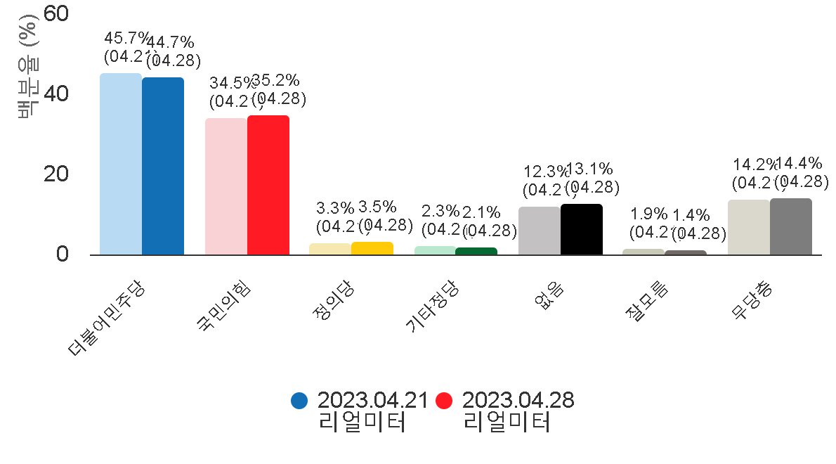 [4¿ù5ÁÖ Á¤´çÁöÁöµµ]±¹¹ÎÀÇÈû 0.7%p »ó½Â 35.2%, ´õºÒ¾î¹ÎÁÖ´ç 1%p Ç϶ô 44.7%, 1-2À§ °ÝÂ÷´Â 9.5%p(¸®¾ó¹ÌÅÍ)