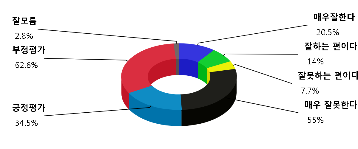 »ó¼¼ °á°ú°¡ ¡¸¸Å¿ì À߸øÇÑ´Ù¡¹(55%)(2.1%¡é), ¡¸¸Å¿ìÀßÇÑ´Ù¡¹(20.5%)(1.9%¡è), ¡¸ÀßÇÏ´Â ÆíÀÌ´Ù¡¹(14%)(1.9%¡è), ¡¸À߸øÇÏ´Â ÆíÀÌ´Ù¡¹(7.7%)(1.9%¡è)¼øÀ¸·Î Áý°èµÇ¾ú´Ù.