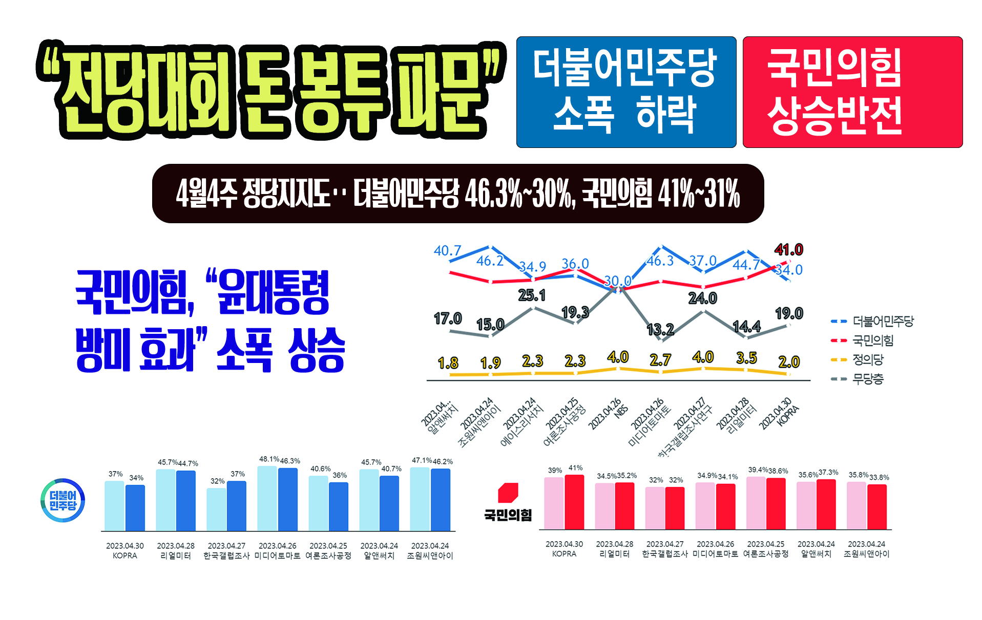 2023³â 4¿ù 4ÁÖ(2023³â 4¿ù 24ÀÏ ~ 2023³â 4¿ù 30ÀÏ) ±â°£¿¡ °øÇ¥µÈ ÃÑ 9°Ç(ÀüÈ ¸éÁ¢¿ø 2°Ç, ARS 7°Ç)ÀÇ ¡¸Á¤´çÁöÁöµµ¡¹Á¶»ç¿¡¼'´õºÒ¾î¹ÎÁÖ´ç'Àº ÃÖ°í 46.3%~ÃÖÀú 30%(Æò±Õ 38.9%),'±¹¹ÎÀÇÈû'Àº ÃÖ°í 41%~ÃÖÀú 31%(Æò±Õ 35.3%),'Á¤ÀÇ´ç'Àº ÃÖ°í 4%~ÃÖÀú 1.8%(Æò±Õ 2.7%),'¹«´çÃþ'Àº ÃÖ°í 33%~ÃÖÀú 13.2%(Æò±Õ 20%)ÀÇ ÁöÁöÀ²À» º¸¿´´Ù.