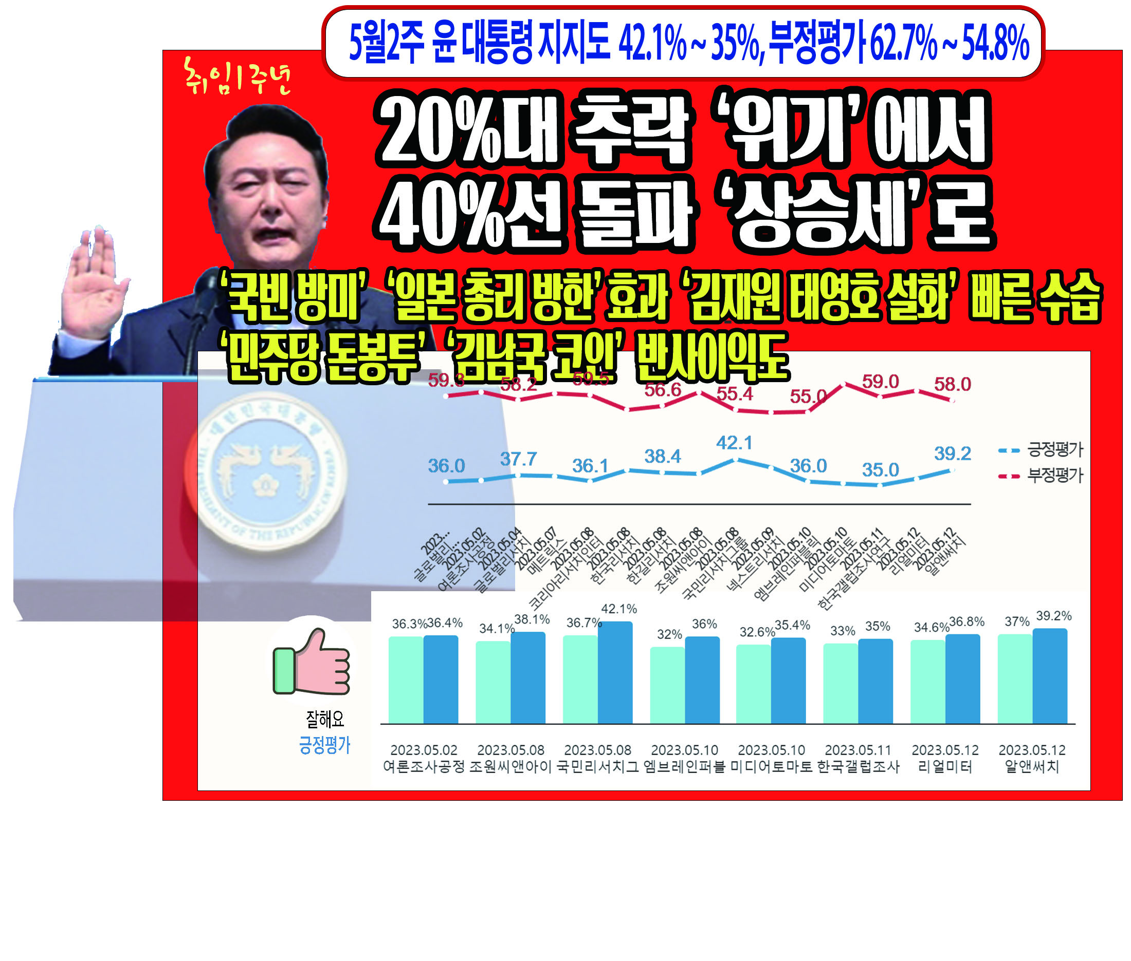 ÃÖ±Ù 5¿ù 1~2ÁÖ ±â°£ (2023³â 4¿ù 30ÀÏ ~ 2023³â 5¿ù 12ÀÏ) µ¿¾È °øÇ¥µÈ ÃÑ 15°Ç(ÀüÈ ¸éÁ¢¿ø 8°Ç, ARS 7°Ç)ÀÇ ¡¸´ëÅë·É ±¹Á¤ ¿î¿µ ÁöÁöµµ¡¹Á¶»ç¿¡¼ '¸Å¿ì ÀßÇÑ´Ù' ¿Í 'ÀßÇÏ´Â ÆíÀÌ´Ù'¸¦ ÇÕÇÑ '±àÁ¤Æò°¡'´Â ÃÖ°í 42.1%~ÃÖÀú 35%(Æò±Õ 37.6%), 'À߸øÇÏ´Â ÆíÀÌ´Ù' ¿Í '¸Å¿ì À߸øÇÑ´Ù'¸¦ ÇÕÇÑ 'ºÎÁ¤Æò°¡'´Â ÃÖ°í 62.7%~ÃÖÀú 54.8%(Æò±Õ 58.4%)ÀÇ ÁöÁöÀ²À» º¸¿´´Ù.
