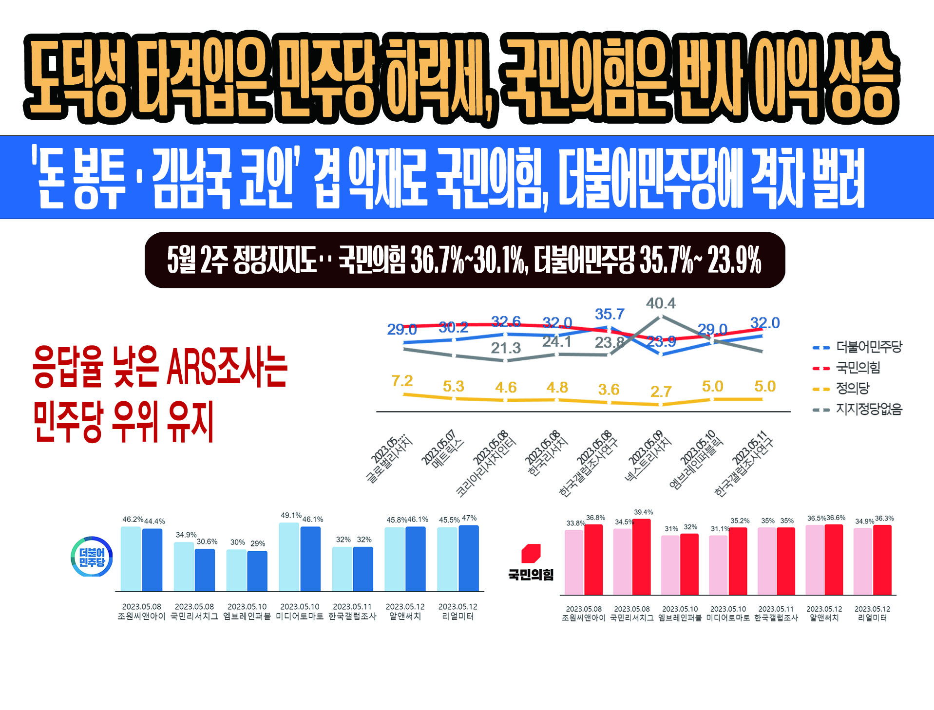 ÃÖ±Ù 5¿ù 1ÁÖ~2ÁÖ (2023³â 4¿ù 30ÀÏ ~ 2023³â 5¿ù 12ÀÏ)±â°£ µ¿¾È °øÇ¥µÈ ÃÑ 15°Ç(ÀüÈ ¸éÁ¢¿ø 8°Ç, ARS 7°Ç)ÀÇ ¡¸Á¤´çÁöÁöµµ¡¹Á¶»ç¿¡¼'´õºÒ¾î¹ÎÁÖ´ç'Àº ÃÖ°í 47%~ÃÖÀú 23.9%(Æò±Õ 34.9%),'±¹¹ÎÀÇÈû'Àº ÃÖ°í 41%~ÃÖÀú 30.1%(Æò±Õ 35.6%),'Á¤ÀÇ´ç'Àº ÃÖ°í 7.2%~ÃÖÀú 1.6%(Æò±Õ 3.8%),'ÁöÁöÁ¤´ç¾øÀ½'Àº ÃÖ°í 40.4%~ÃÖÀú 11.2%(Æò±Õ 22.2%)ÀÇ ÁöÁöÀ²À» º¸¿´´Ù.