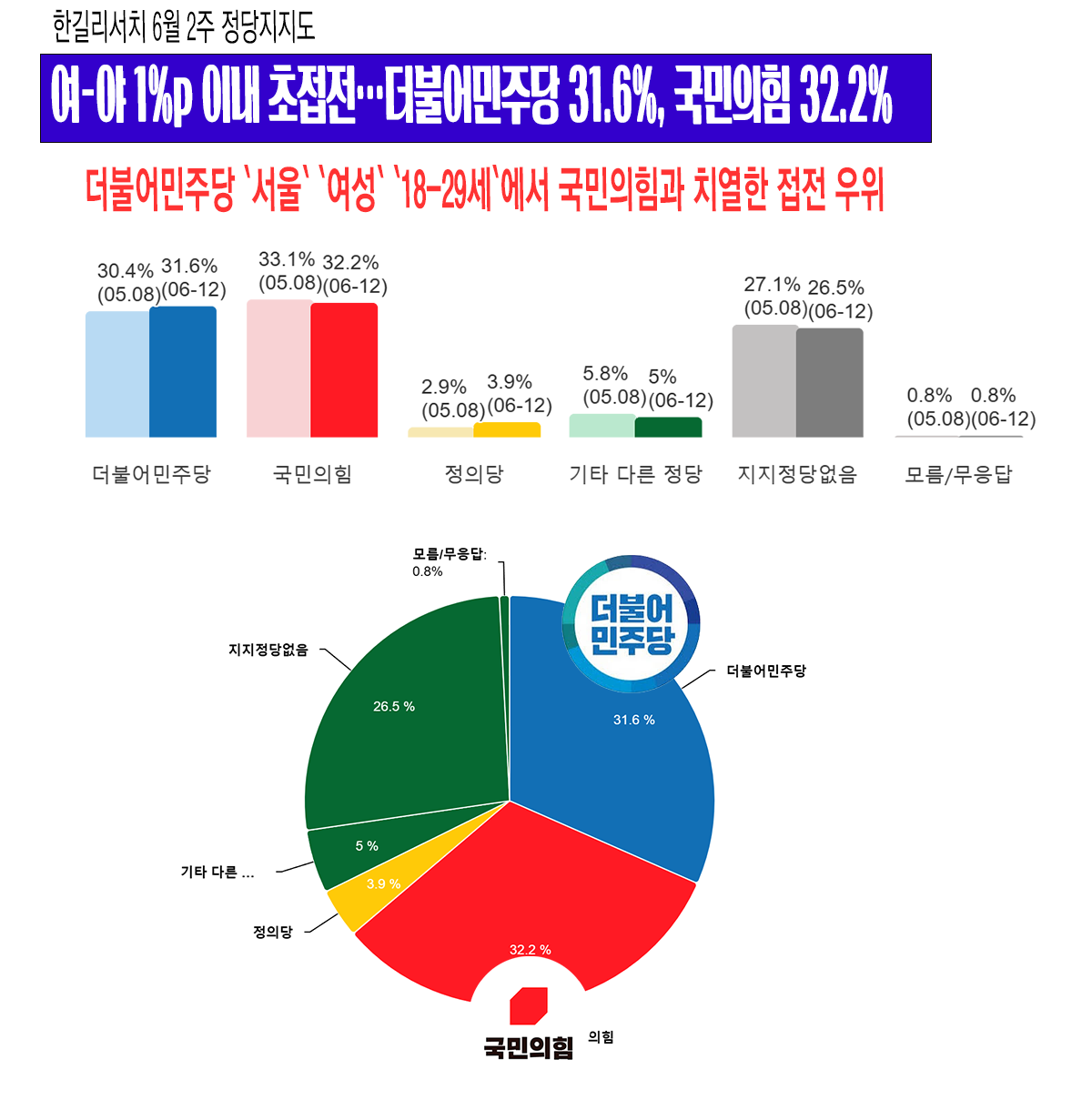 ´õºÒ¾î¹ÎÁÖ´ç 1.2%p »ó½Â 31.6%, Á¤ÀÇ´ç 1%p »ó½Â 3.9%, ±¹¹ÎÀÇÈû 0.9%p Ç϶ô 32.2%, 1-2À§ °ÝÂ÷´Â 0.6%p