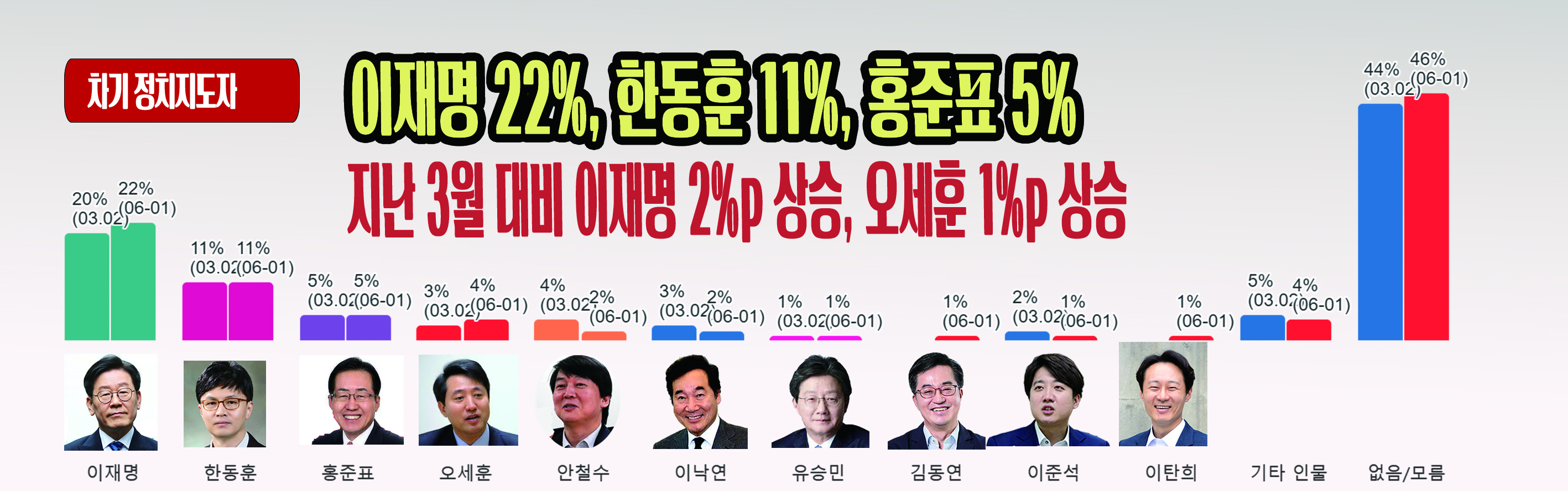 Â÷±â Á¤Ä¡ ÁöµµÀÚ ¼±È£µµ¡¥ÀÌÀç¸í 2%p »ó½Â 22%, Çѵ¿ÈÆ 11%, È«ÁØÇ¥ 5%