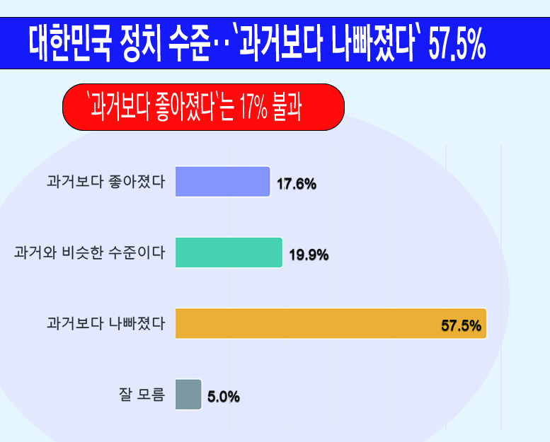 ¤ýÇöÀç ±¹³» Á¤Ä¡ ¼öÁØ Àνġ¥°ú°Åº¸´Ù ³ªºüÁ³´Ù 57.5%, °ú°Å¿Í ºñ½ÁÇÑ ¼öÁØÀÌ´Ù 19.9%, °ú°Åº¸´Ù ÁÁ¾ÆÁ³´Ù 17.6%