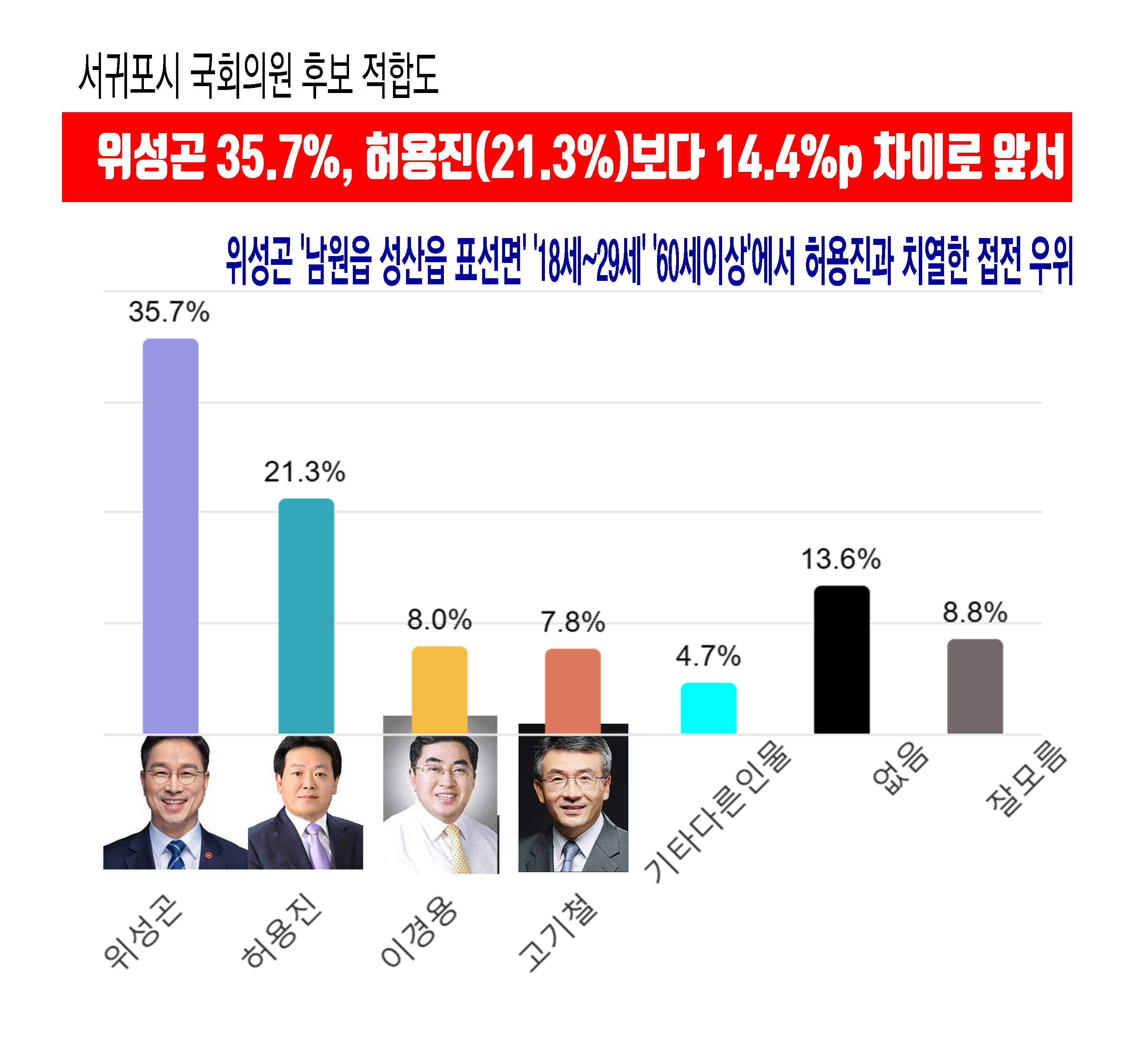¼±ÍÆ÷½Ã ±¹È¸ÀÇ¿ø Èĺ¸ ÀûÇÕµµ¡¥'À§¼º°ï' 35.7%, 'Çã¿ëÁø'(21.3%)º¸´Ù 14.4%p Â÷ÀÌ·Î ¾Õ¼