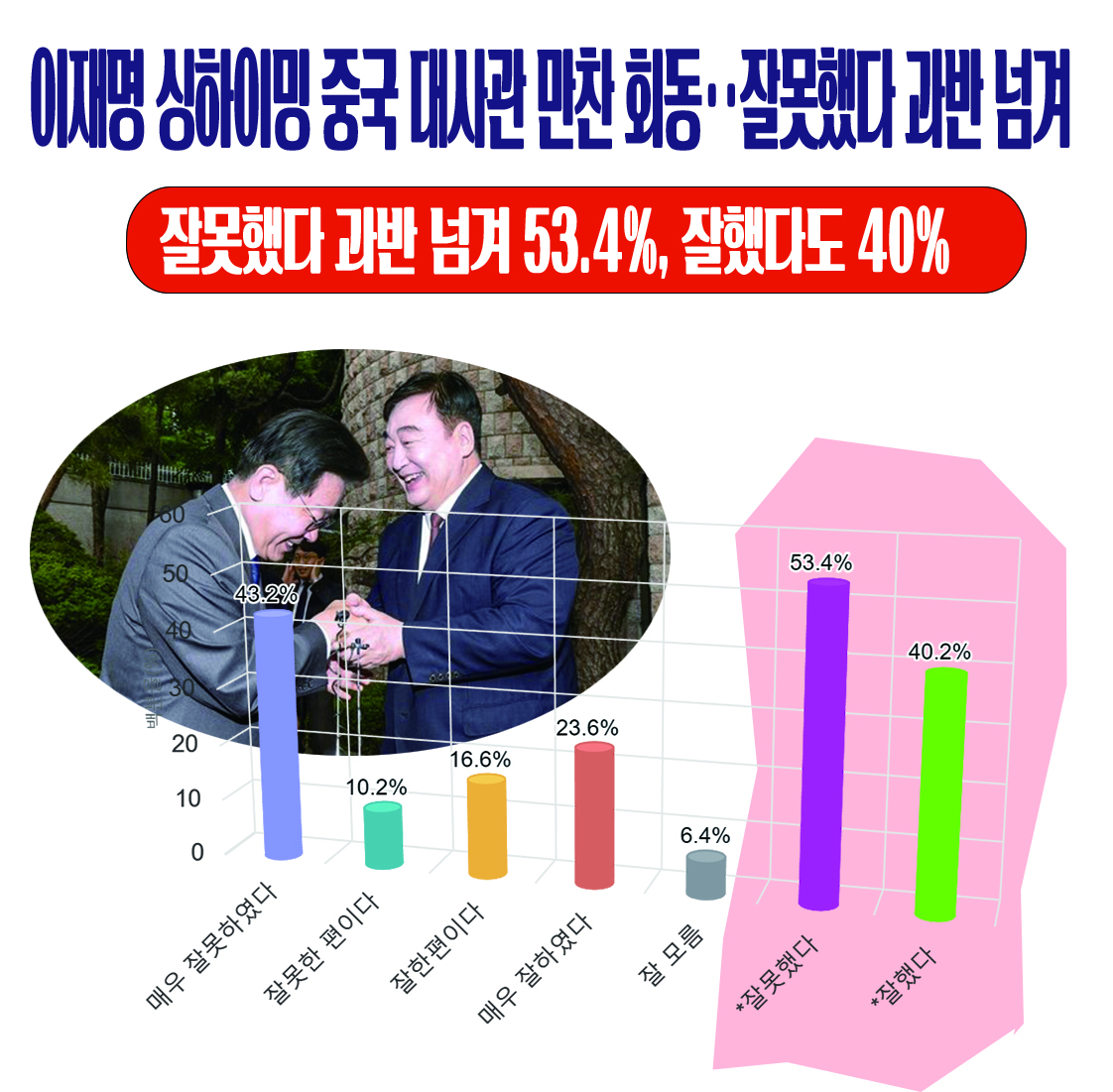 ¡Þ ¡¸ÀÌÀç¸í ´ëÇ¥ Áß±¹´ë»ç°ü ¸¸Âù ȸµ¿ ¡¹ 'À߸øÇß´Ù' 53.4%, 'ÀßÇß´Ù'(40.2%)º¸´Ù 13.2%p ´õ ³ô¾Æ