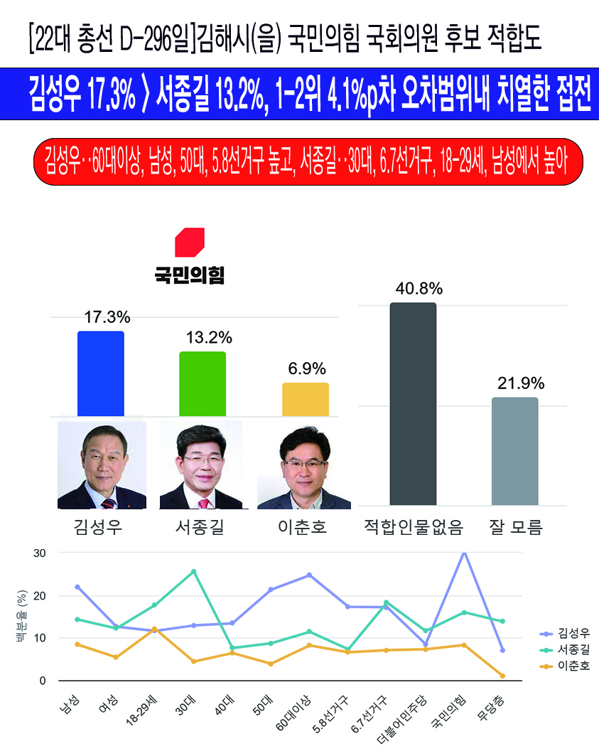 ³»³â Á¦22´ë ±¹È¸ÀÇ¿ø ¼±°Å¸¦ 296ÀÏ ¾ÕµÎ°í Á¶»çµÈ Á¦22´ë ±¹È¸ÀÇ¿ø¼±°Å ¼±°Å±¸ ¡¸±èÇØ½ÃÀ» ±¹¹ÎÀÇÈû ±¹È¸ÀÇ¿ø Èĺ¸ ÀûÇÕµµ¡¹¿©·ÐÁ¶»ç¿¡¼ ±è¼º¿ì Çö ±¹¹ÎÀÇÈû ±èÇØÀ» ´çÇùÀ§¿øÀåÀÌ 17.3%¸¦ ¾ò¾î 13.2%¸¦ ¾òÀº ¼Á¾±æ Àü °æ³²µµÀÇ¿ø°ú 4.1%p Â÷ÀÌ·Î ÃÊ Á¢ÀüÀ» ¹úÀÌ´Â °ÍÀ¸·Î ³ªÅ¸³µ´Ù.