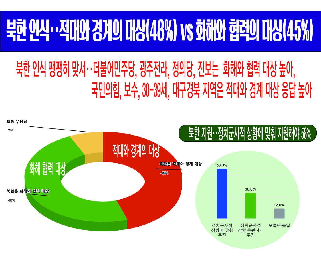 ¡¸ºÏÇÑÀº ÈÇØ¿Í Çù·Â ´ë»ó¡¹´Â(Àº) ´õºÒ¾î¹ÎÁÖ´ç ÁöÁöÃþ(78%), ±¤ÁÖÀü¶ó Áö¿ª(71%), Á¤ÀÇ´ç ÁöÁöÃþ(70%), Áøº¸ ¼ºÇâ(69%)¿¡¼ ³ô¾Ò°í, ¡¸ºÏÇÑÀº Àû´ë¿Í °æ°è ´ë»ó¡¹´Â(Àº) ±¹¹ÎÀÇÈû ÁöÁöÃþ(68%), º¸¼ö ¼ºÇâ(63%), 30-39¼¼ ¿¬·ÉÃþ(60%), ´ë±¸°æºÏ Áö¿ª(58%)¿¡¼ »ó´ëÀûÀ¸·Î ³ôÀº °æÀï·ÂÀ» º¸¿´´Ù.