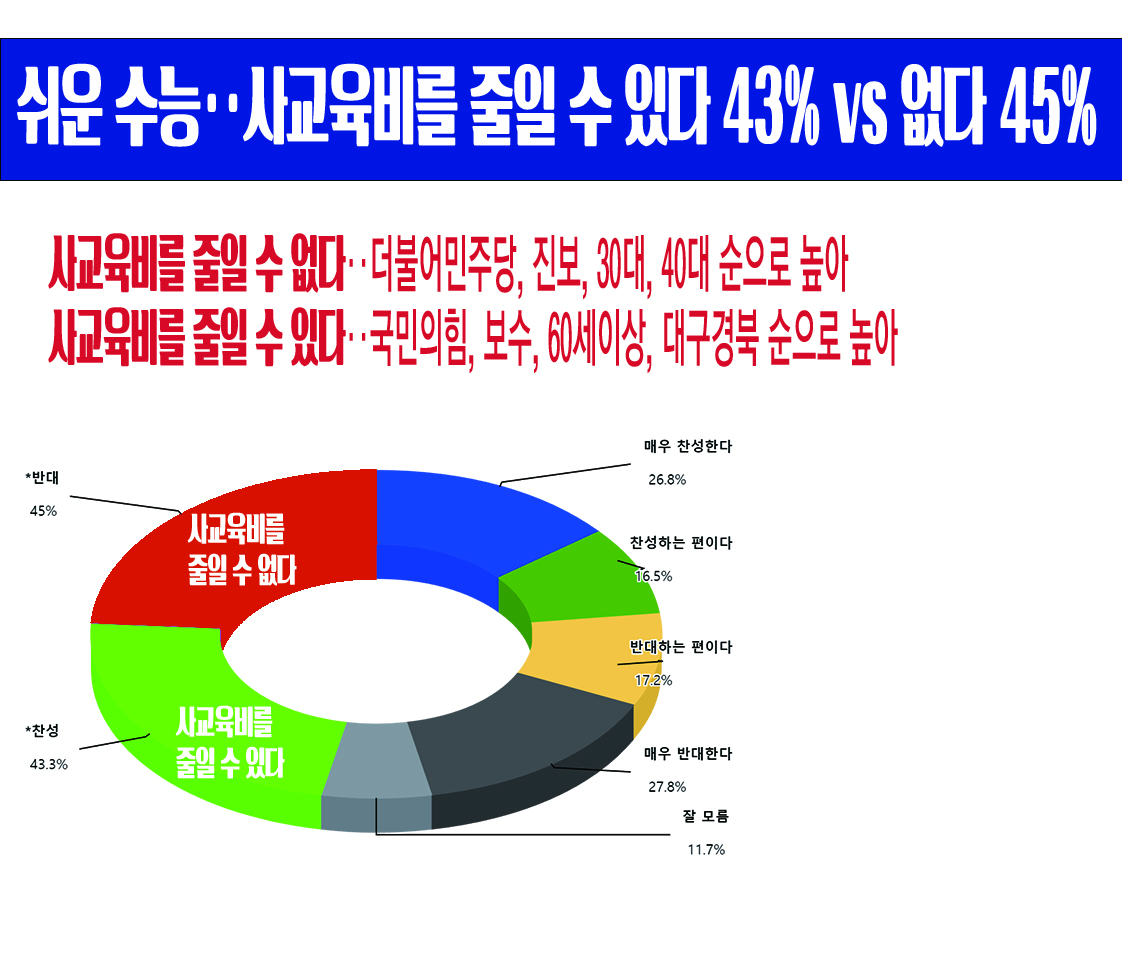 Á¶»ç±â°ü ¾Ë¾Ø½áÄ¡°¡ 6¿ù 21ÀÏ¿¡¼­ 23ÀϱîÁö »çÈê°£ ½Ç½ÃÇÏ¿© 25ÀÏ ¹ßÇ¥ÇÑ ¡¸½¬¿î ¼ö´É »ç±³À°ºñ Àý°¨ ÁÖÀå Âù/¹Ý¡¹Á¶»ç¿¡¼­ '¸Å¿ì Âù¼ºÇÑ´Ù'¿Í 'Âù¼ºÇÏ´Â ÆíÀÌ´Ù'¸¦ ÇÕÇÑ ¡¸Âù¼º¡¹Àº 43.3%À̸ç, '¹Ý´ëÇÏ´Â ÆíÀÌ´Ù'¿Í '¸Å¿ì ¹Ý´ëÇÑ´Ù'¸¦ ÇÕÇÑ ¡¸¹Ý´ë¡¹´Â 45%·Î ³ª¿Ô´Ù.