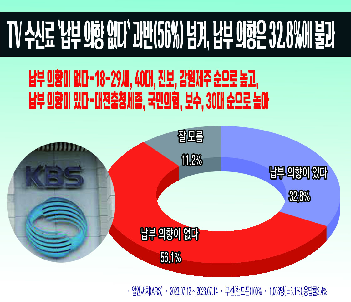 Á¶»ç±â°ü ¾Ë¾Ø½áÄ¡°¡ 7¿ù 12ÀÏ¿¡¼ 14ÀϱîÁö »çÈê°£ ½Ç½ÃÇÏ¿© 16ÀÏ ¹ßÇ¥ÇÑ ¡¸TV¼ö½Å·á ³³ºÎ ÀÇÇ⡹Á¶»ç¿¡¼ ¡¸TV¼ö½Å·á ³³ºÎ ÀÇÇâÀÌ ¾ø´Ù¡¹°¡ °ú¹ÝÀÌ ³Ñ´Â 56.1%¸¦ ±â·ÏÇÏ¿© ¡¸³³ºÎ ÀÇÇâÀÌ ÀÖ´Ù¡¹(32.8%)¿¡ 23.3%p ´õ ³ôÀº °ÍÀ¸·Î ³ªÅ¸³µ´Ù.