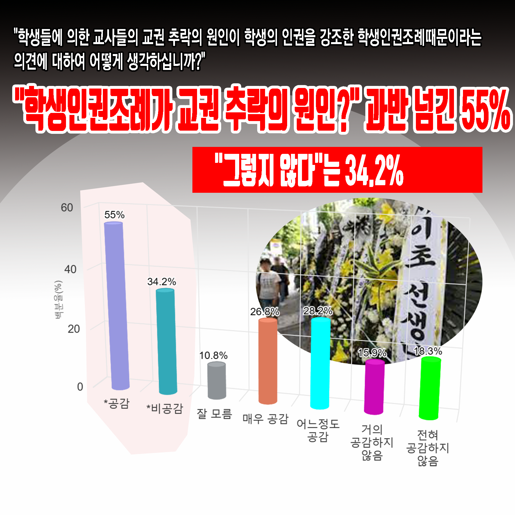 "Çлýµé¿¡ ÀÇÇÑ ±³»çµéÀÇ ±³±Ç Ãß¶ôÀÇ ¿øÀÎÀÌ ÇлýÀÇ ÀαÇÀ» °Á¶ÇÑ ÇлýÀαÇÁ¶·Ê¶§¹®À̶ó´Â Àǰ߿¡ ´ëÇÏ¿© ¾î¶»°Ô »ý°¢ÇϽʴϱî?" ¶ó´Â Áú¹®¿¡ '°ø°¨ÇÑ´Ù'´Â ÀÀ´äÀÌ 55%·Î °ú¹ÝÀ» ³Ñ°å´Ù.