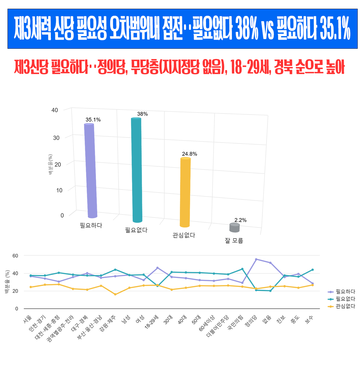 ³»³â Á¦22´ë ±¹È¸ÀÇ¿ø ¼±°Å¸¦ 253ÀÏ ¾ÕµÎ°í Á¶»çµÈ ¡¸Á¦3¼¼·Â ½Å´ç Çʿ伺¡¹Á¶»ç¿¡¼ 'ÇÊ¿ä¾ø´Ù'°¡ 38%¸¦ ¾ò¾î 'ÇÊ¿äÇÏ´Ù'(35.1%)¿Í 2.9%p Â÷ÀÌ·Î ÃÊ ¹ÚºùÀÇ Á¢ÀüÀ» ¹úÀÌ´Â °ÍÀ¸·Î ³ªÅ¸³µ´Ù.