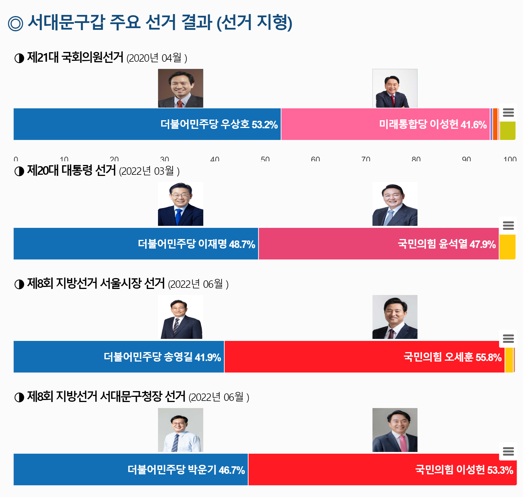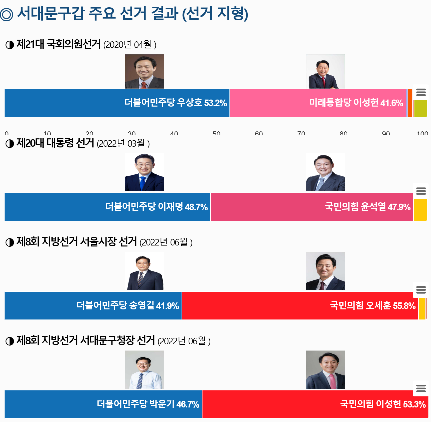 ¼´ë¹®±¸°© ¼±°Å±¸´Â ±¹¹ÎÀÇÈûÀÌ ÃÖ±Ù 2°Ç, ´õºÒ¾î¹ÎÁÖ´çÀÌ 1°Ç °¢°¢ ½Â¸®ÇÑ Áö¿ªÀ¸·Î, ±¹¹ÎÀÇÈûÀº ¼¿ï½ÃÀå ¼±°Å, ¼´ë¹®±¸Ã»Àå ¼±°Å¿¡¼ ½Â¸®ÇÏ¿´À¸¸ç, ´õºÒ¾î¹ÎÁÖ´çÀº Á¦20´ë ´ëÅë·É ¼±°Å¿¡¼ ½Â¸®ÇÏ¿´´Ù.