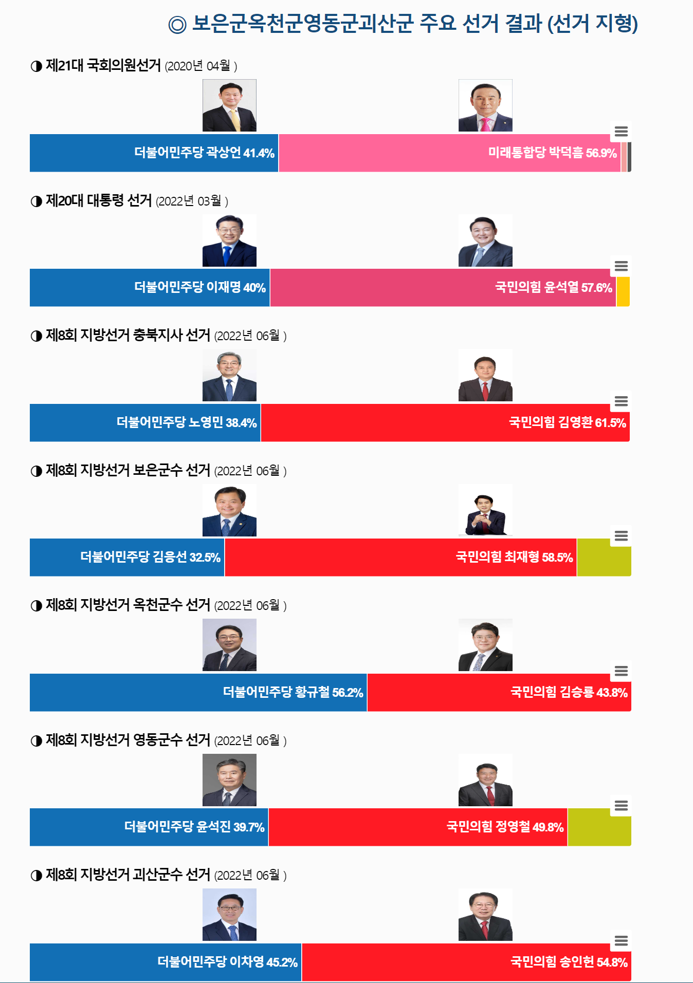 º¸Àº±º ¿Áõ±º ¿µµ¿±º ±«»ê±º ¼±°Å±¸´Â ±¹¹ÎÀÇÈûÀÌ ÃÖ±Ù 5°Ç, ´õºÒ¾î¹ÎÁÖ´çÀÌ 1°Ç °¢°¢ ½Â¸®ÇÑ Áö¿ªÀ¸·Î, ±¹¹ÎÀÇÈûÀº ÃæºÏÁö»ç ¼±°Å, Á¦20´ë ´ëÅë·É ¼±°Å, º¸Àº±º¼ö ¼±°Å, ¿µµ¿±º¼ö ¼±°Å, ±«»ê±º¼ö ¼±°Å¿¡¼ ½Â¸®ÇÏ¿´À¸¸ç, ´õºÒ¾î¹ÎÁÖ´çÀº ¿Áõ±º¼ö ¼±°Å¿¡¼ ½Â¸®ÇÏ¿´´Ù.