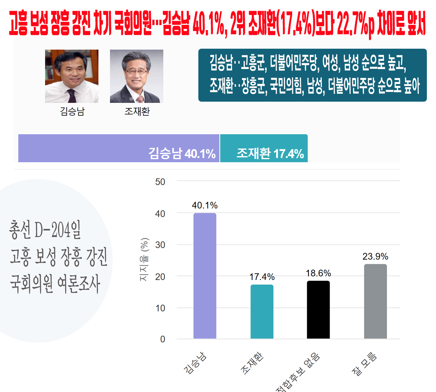 ³»³â Á¦22´ë ±¹È¸ÀÇ¿ø ¼±°Å¸¦ 204ÀÏ ¾ÕµÎ°í Á¶»çµÈ Àü¶ó³²µµ °íÈﱺ º¸¼º±º ÀåÈﱺ °Áø±º ±¹È¸ÀÇ¿ø ¼±°Å±¸ ¡¸°íÈï º¸¼º ÀåÈï °Áø ±¹È¸ÀÇ¿ø ÀûÇÕµµ¡¹¿©·ÐÁ¶»ç¿¡¼ ±è½Â³² Çö ±¹È¸ÀÇ¿øÀÌ 40.1%, Á¶Àçȯ Àü ÃÊ´ç´ëÇб³ °âÀÓ±³¼ö°¡ 17.4%ÀÇ ±â·ÏÀ» º¸¿´´Ù.