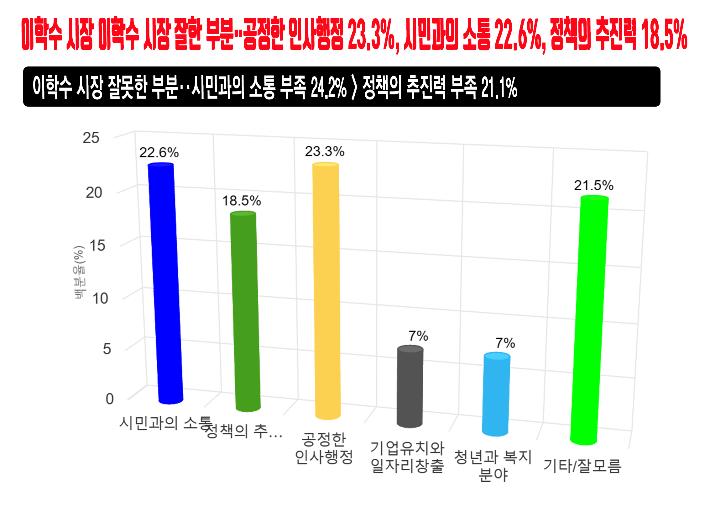 ¡¸ÀÌÇмö ½ÃÀå ½ÃÁ¤¿î¿µ À߸øÇÑ ºÎºÐ¡¹Áú¹®¿¡ ¡¸½Ã¹Î°úÀÇ ¼ÒÅë ºÎÁ·¡¹ÀÌ 24.2%¸¦ ±â·ÏÇÏ¿© 2À§ ¡¸Á¤Ã¥ÀÇ ÃßÁø·Â ºÎÁ·¡¹(21.1%)¿¡ 3.1%p Â÷ÀÌ·Î ¾Õ¼­ ³ª°¡¸ç, µÚ¸¦ ÀÌ¾î ¡¸°øÁ¤ÇÏÁö ¾ÊÀº ÀλçÇàÁ¤¡¹ÀÌ 18.4%, ¡¸±â¾÷À¯Ä¡¿Í ÀÏÀÚ¸® âÃâ ºÎÁ·¡¹ÀÌ 17.6%, ¡¸Ã»³â°ú º¹Áö ºÐ¾ß ¹ÌÈí¡¹ÀÌ 12.5%¸¦ ÇÏ´Â °ÍÀ¸·Î ±â·ÏµÇ¾ú´Ù. ¡¸±âŸ/À߸𸧡¹6.3%ÀÇ ÀÀ´äµµ ±â·ÏµÇ¾ú´Ù.