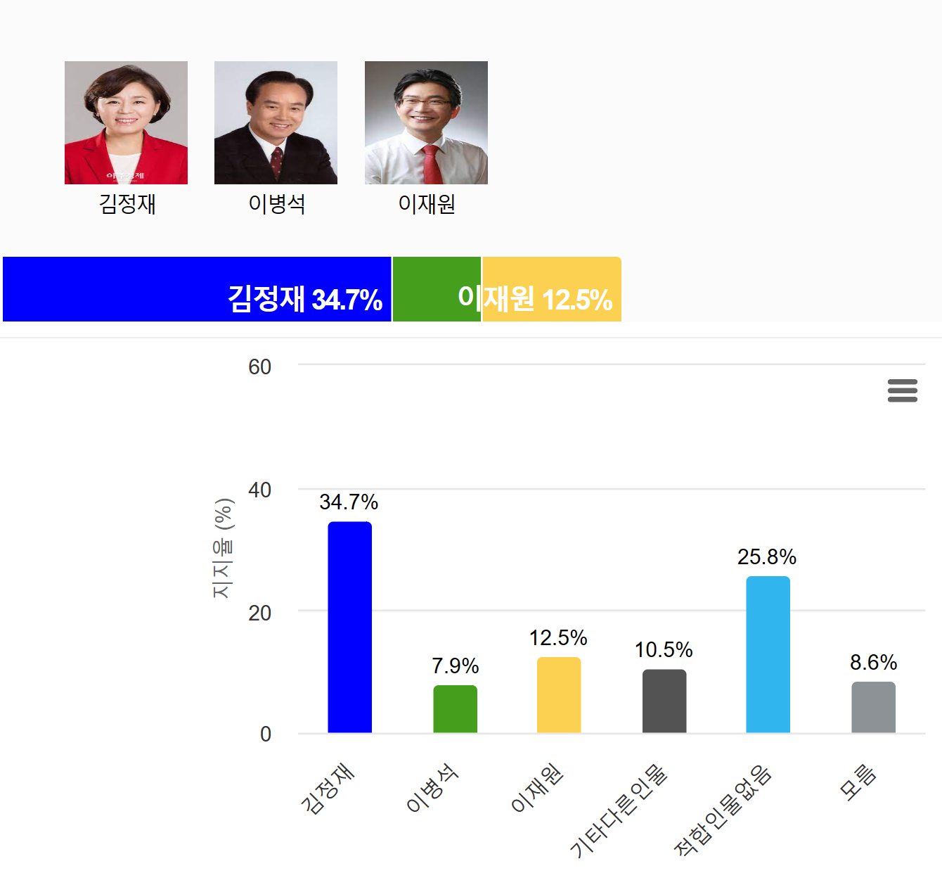 ¡Þ ±èÁ¤Àç 34.7%, 2À§ ÀÌÀç¿ø(12.5%)º¸´Ù 22.2%p Â÷ÀÌ·Î ¾Õ¼­