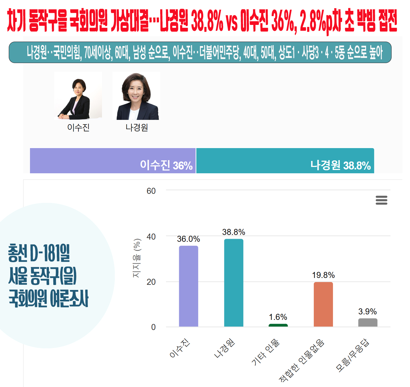 ³»³â Á¦22´ë ±¹È¸ÀÇ¿ø ¼±°Å¸¦ 181ÀÏ ¾ÕµÎ°í Á¶»çµÈ ¼¿ïƯº°½Ã µ¿ÀÛ±¸ À» ¼±°Å±¸ ¡¸À̼öÁø vs ³ª°æ¿ø °¡»ó´ë°á¡¹¿©·ÐÁ¶»ç¿¡¼ ³ª°æ¿ø Àü ±¹È¸ÀÇ¿øÀÌ 38.8%¸¦ ¾ò¾î 'À̼öÁø'(36%) Èĺ¸¿Í 2.8%p Â÷ÀÌ·Î ÃÊ ¹ÚºùÀÇ Á¢ÀüÀ» ¹úÀÌ´Â °ÍÀ¸·Î ³ªÅ¸³µ´Ù.