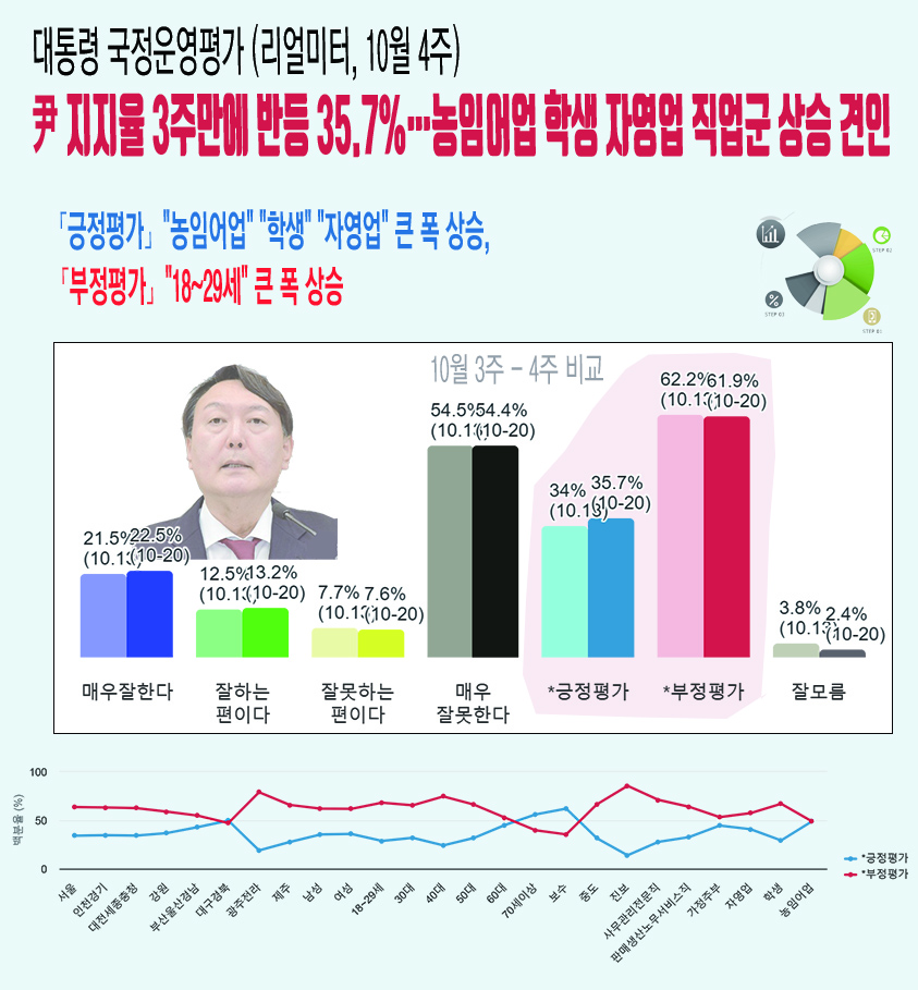 Á¶»ç±â°ü ¸®¾ó¹ÌÅͰ¡ 10¿ù 19ÀÏ¿¡¼ 20ÀϱîÁö ÀÌÆ²°£ ½Ç½ÃÇÏ¿© 30ÀÏ ¹ßÇ¥ÇÑ ¡¸´ëÅë·É Á÷¹«¼öÇà Æò°¡¡¹Á¶»ç¿¡¼ '¸Å¿ìÀßÇÑ´Ù'¿Í 'ÀßÇÏ´Â ÆíÀÌ´Ù'¸¦ ÇÕÇÑ ¡¸±àÁ¤Æò°¡¡¹´Â 35.7%À̸ç, 'À߸øÇÏ´Â ÆíÀÌ´Ù'¿Í '¸Å¿ì À߸øÇÑ´Ù'¸¦ ÇÕÇÑ ¡¸ºÎÁ¤Æò°¡¡¹´Â 62%·Î ³ª¿Ô´Ù.