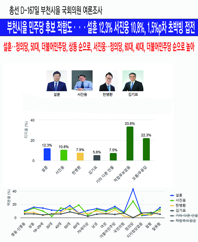 ³»³â Á¦22´ë ±¹È¸ÀÇ¿ø ¼±°Å¸¦ 167ÀÏ ¾ÕµÎ°í Á¶»çµÈ °æ±âµµ ºÎõ½ÃÀ» ¼±°Å±¸ ¡¸´õºÒ¾î¹ÎÁÖ´ç Èĺ¸ ÀûÇÕµµ¡¹¿©·ÐÁ¶»ç¿¡¼ ¼³ÈÆ Çö ±¹È¸ÀÇ¿øÀÌ 12.3%¸¦ ¾ò¾î 10.8%¸¦ ¾òÀº ¼Áø¿õ Àü ±¹¹«ÃѸ®½Ç Á¤¹«Çù·Âºñ¼°ü¿Í 1.5%p Â÷ÀÌ·Î ÃÊ ¹ÚºùÀÇ Á¢ÀüÀ» ¹úÀÌ´Â °ÍÀ¸·Î ³ªÅ¸³µ´Ù.