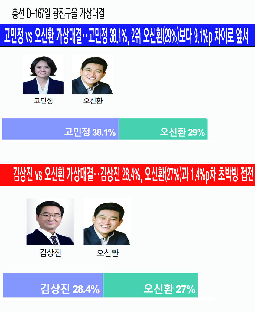 ¡¸±è»óÁø¡¹È帴 "±¤Áø±¸Á¦3¼±°Å±¸" Áö¿ª, "±¤Áø±¸Á¦4¼±°Å±¸" Áö¿ª, "18-29¼¼" ¿¬·ÉÃþ¿¡¼ 1À§¸¦ ÇÏ¿´À¸³ª 2À§¸¦ ±â·ÏÇÑ ¡¸¿À½Åȯ¡¹Èĺ¸¿Í 3%À̳» ÃÊÁ¢Àü °æÇÕÀ» ¹ú¿´´Ù.