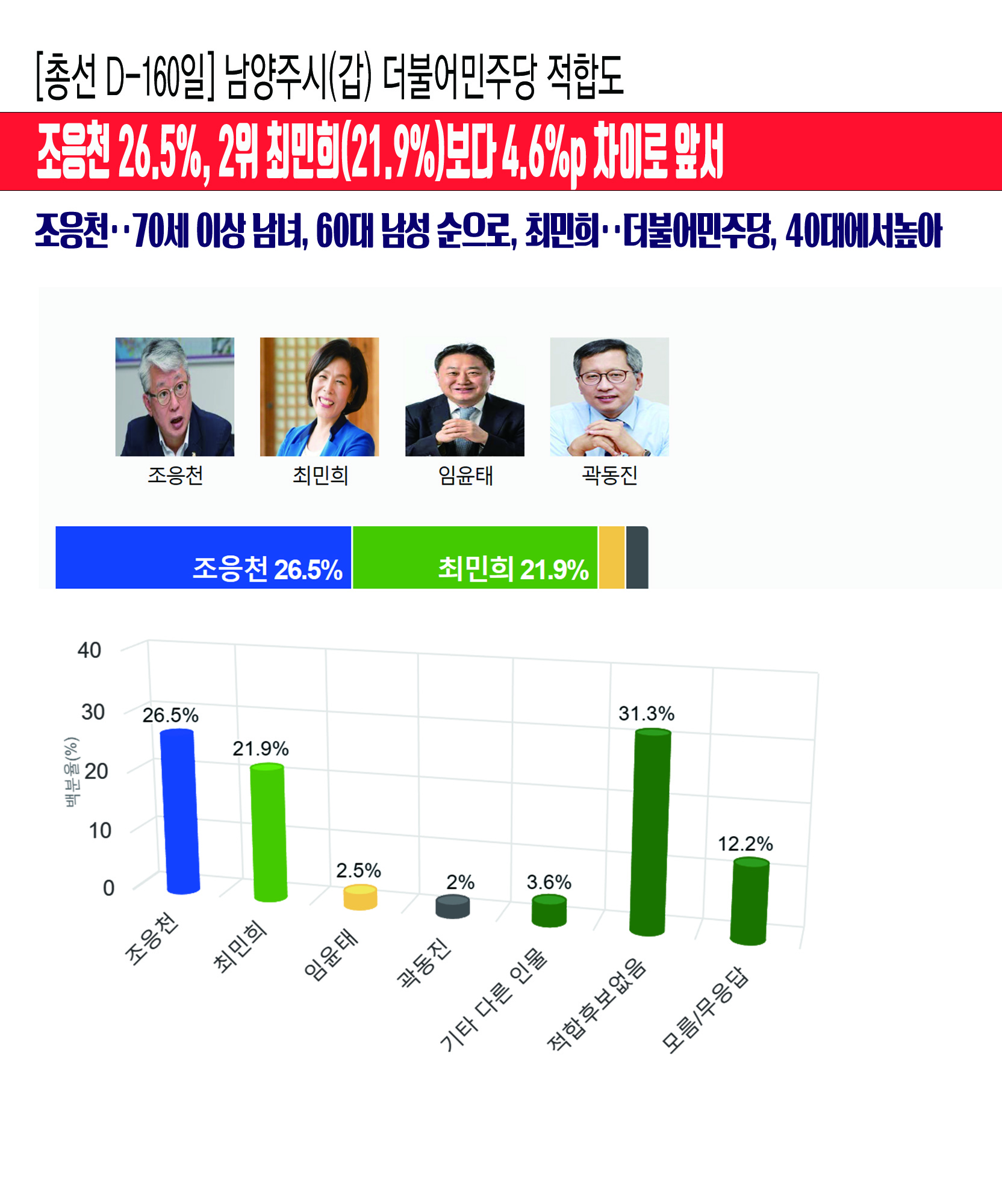 ³»³â Á¦22´ë ±¹È¸ÀÇ¿ø ¼±°Å¸¦ 160ÀÏ ¾ÕµÎ°í Á¶»çµÈ °æ±âµµ ³²¾çÁÖ½Ã(°©) ¼±°Å±¸ ¡¸³²¾çÁÖ°© ´õºÒ¾î¹ÎÁÖ´ç Èĺ¸ÀûÇÕµµ¡¹´Â Á¶ÀÀõ Çö ±¹È¸ÀÇ¿øÀÌ 26.5%¸¦ ¾ò¾î 21.9%¸¦ ¾òÀº ÃÖ¹ÎÈñ Àü ±¹È¸ÀÇ¿ø°ú 4.6%p Â÷ÀÌ·Î ÃÊ Á¢ÀüÀ» ¹úÀÌ´Â °ÍÀ¸·Î ³ªÅ¸³µ´Ù.