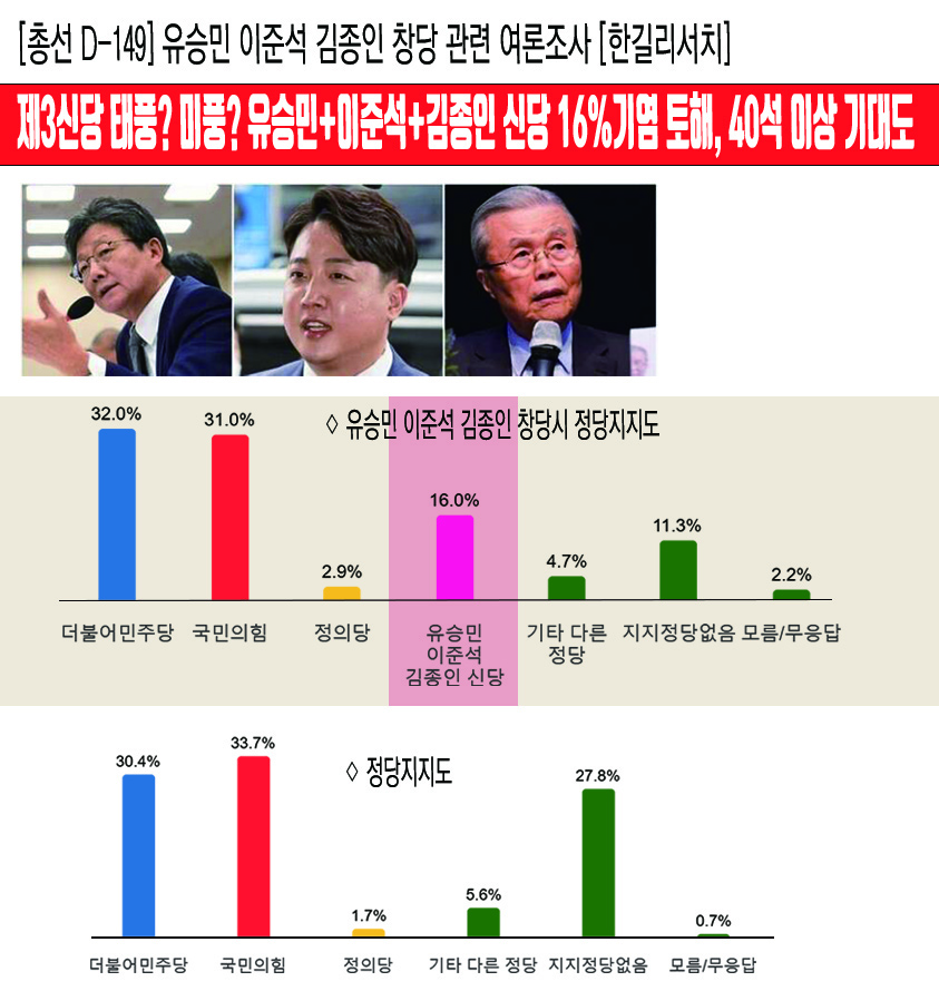 ±èÁ¾ÀÎ Àü ºñ»ó´ëÃ¥À§¿øÀ塤À¯½Â¹Î Àü ÀÇ¿ø¡¤ÀÌÁؼ® Àü ´ëÇ¥ ¹ß(Û¡) ½Å´çÀÌ Ã¢´çµÉ °æ¿ì, ±¹¹ÎÀÇÈû 33.7%, ´õºÒ¾î¹ÎÁÖ´ç 30.4%¿¡ À̾î 3À§ÀÎ 16%¸¦ ¾ò´Â °ÍÀ¸·Î ³ª¿Í, "±è¡¤À¯¡¤ÀÌ" ½Å´ç â´ç¼³ÀÌ ¿¬ÀÏ Á¤°¡ÀÇ ÃÖ´ë °ü½ÉÀ¸·Î ¶°¿À¸£°í ÀÖ´Ù.