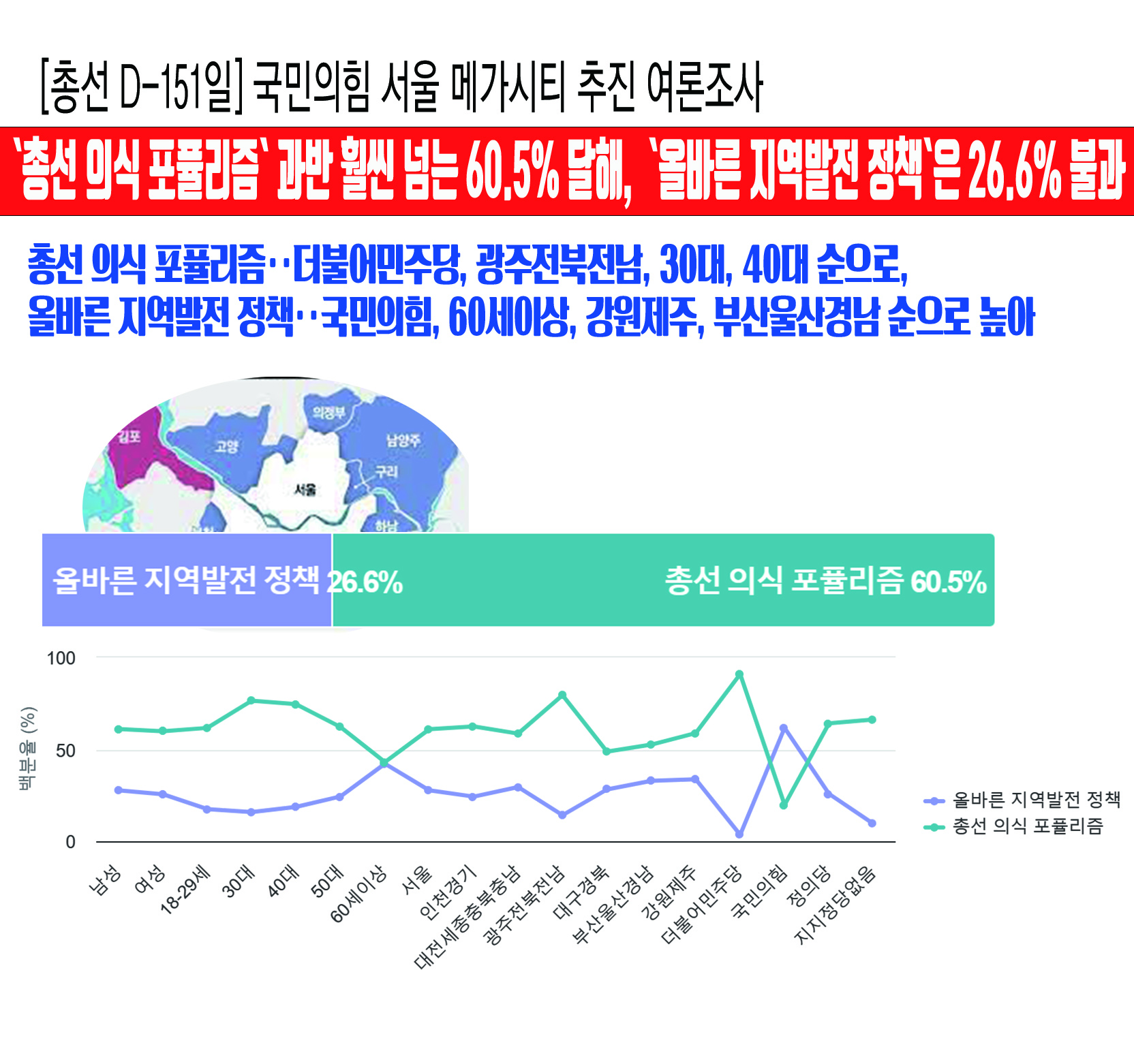 ³»³â Á¦22´ë ±¹È¸ÀÇ¿ø ¼±°Å¸¦ 151ÀÏ ¾ÕµÎ°í Á¶»çµÈ ¡¸±¹¹ÎÀÇÈû ¼­¿ï½Ã ¸Þ°¡½ÃƼ ÃßÁø Àǰߡ¹Á¶»ç¿¡¼­ 'ÃѼ± ÀÇ½Ä Æ÷ǽ¸®Áò'À̶ó´Â ÀÀ´äÀÌ °ú¹ÝÀ» ÈξÀ ³Ñ´Â 60.5%¸¦ ¾ò¾î '¿Ã¹Ù¸¥ Áö¿ª¹ßÀü Á¤Ã¥'(26.6%)À̶ó´Â ÀÀ´äº¸´Ù 33.9%p ´õ ³ô°Ô ³ª¿Ô´Ù.