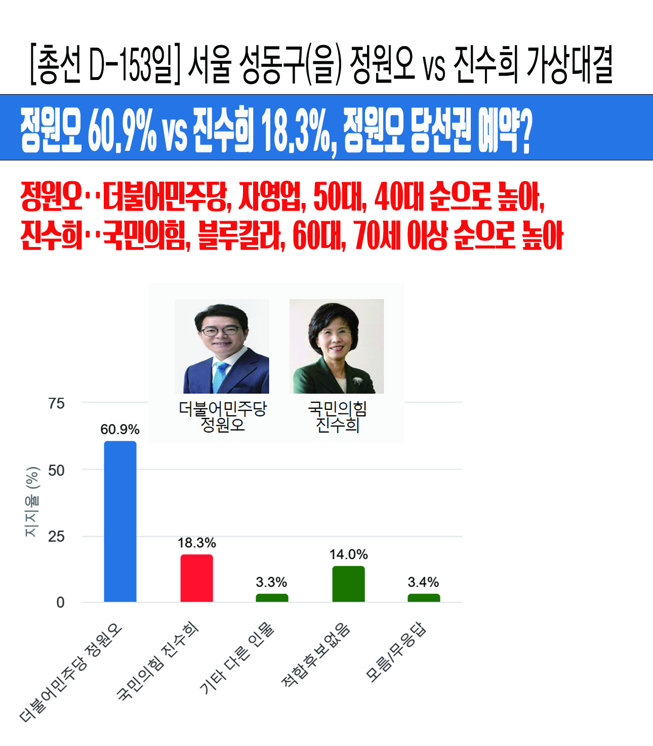 ³»³â Á¦22´ë ±¹È¸ÀÇ¿ø ¼±°Å¸¦ 153ÀÏ ¾ÕµÎ°í Á¶»çµÈ ¼­¿ïƯº°½Ã Áß±¸ ¼ºµ¿±¸(°©) ¼±°Å±¸ ¡¸Á¤¿ø¿À vs Áø¼öÈñ °¡»ó´ë°á¡¹¿¡¼­ '´õºÒ¾î¹ÎÁÖ´ç Á¤¿ø¿À' È帰¡ 60.9%¸¦ ¾ò¾î 18.3%¸¦ ¾òÀº '±¹¹ÎÀÇÈû Áø¼öÈñ' È常¦ 42.6%pÀÇ Å« Â÷ÀÌ·Î ¾Õ¼­ ³ª°¡´Â °ÍÀ¸·Î ³ª¿Ô´Ù.