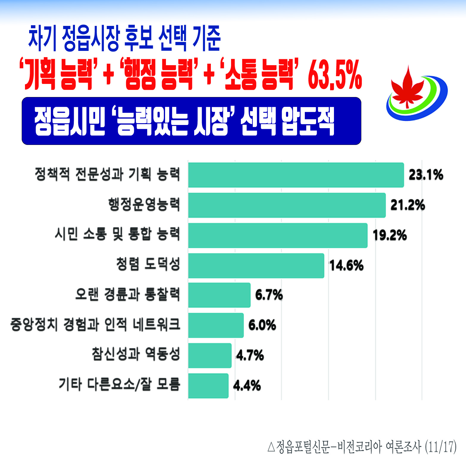 Á¶»ç±â°ü ºñÀüÄÚ¸®¾Æ°¡ 11¿ù 17ÀÏ ÇϷ絿¾È ½Ç½ÃÇÏ¿© 18ÀÏ ¹ßÇ¥ÇÑ ¡¸Â÷±â Á¤À¾½ÃÀå ÁÖ¿ä ¼±Åà ±âÁØ - ´É·Â ÀÚÁú¡¹À» ¹¯´Â Á¶»ç¿¡¼ ¡¸Á¤Ã¥Àû Àü¹®¼º°ú ±âȹ ´É·Â¡¹ÀÌ 23.1%·Î 1À§¸¦, 2À§´Â ¡¸ÇàÁ¤¿î¿µ´É·Â¡¹ 21.2%, ¡¸½Ã¹Î ¼ÒÅë ¹× ÅëÇÕ ´É·Â¡¹ 19.2%·Î 3À§¸¦ Â÷ÁöÇß´Ù. µÚ¸¦ ÀÌ¾î ¡¸Ã»·Å µµ´ö¼º¡¹ÀÌ 14.6%·Î 4À§, ¡¸¿À·£ °æ·û°ú ÅëÂû·Â¡¹ÀÌ 6.7%·Î 5À§, ¡¸Áß¾ÓÁ¤Ä¡ °æÇè°ú ÀÎÀû ³×Æ®¿öÅ©¡¹ 6%·Î 6À§, ¡¸Âü½Å¼º°ú ¿ªµ¿¼º¡¹ÀÌ 4.7%·Î 7À§¸¦ ±â·ÏÇß´Ù. ¡¸±âŸ ´Ù¸¥¿ä¼Ò/Àß ¸ð¸§¡¹4.4%ÀÇ ÀÀ´äµµ ±â·ÏµÇ¾ú´Ù.