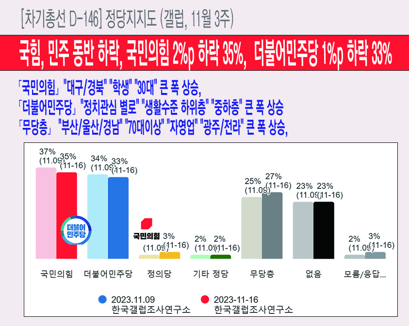 11¿ù 3ÁÖ Á¤´çÁöÁöµµ¡¤¡¤¡¤±¹Èû, ¹ÎÁÖ µ¿¹Ý Ç϶ô, ±¹¹ÎÀÇÈû 2%p Ç϶ô 35%, ´õºÒ¾î¹ÎÁÖ´ç 1%p Ç϶ô 33% [Çѱ¹°¶·´]