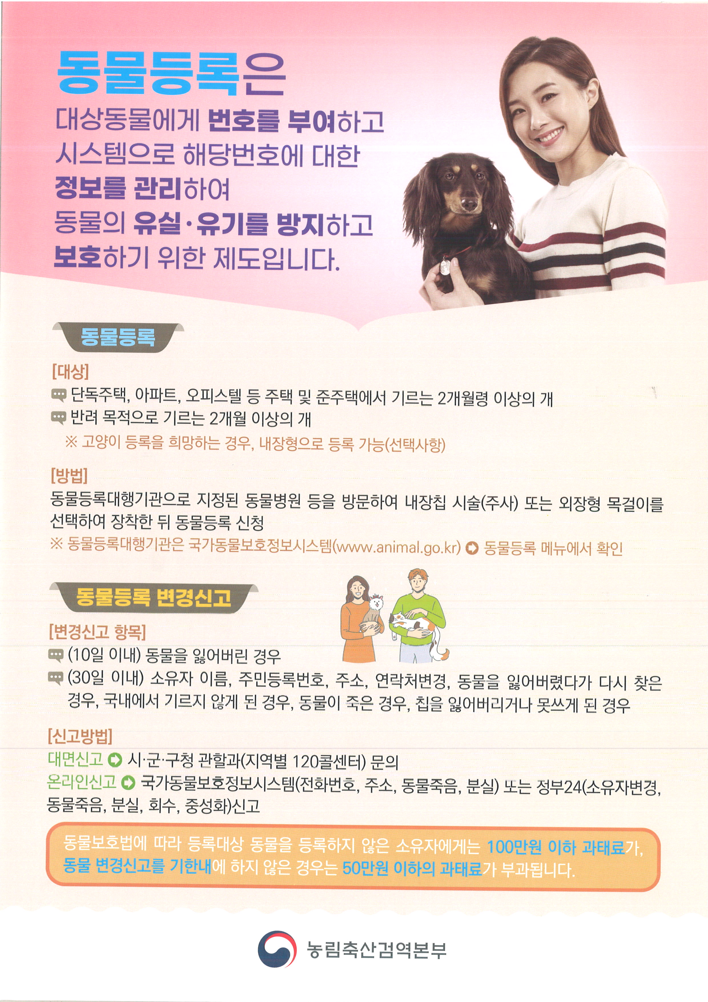 ã¾Æ°¡´Â µ¿¹°µî·Ï ¼ºñ½º´Â µ¿¹°µî·Ï ´ëÇà¾÷ü°¡ ¾ø´Â À¾¤ý¸éÁö¿ª¿¡ °ÅÁÖÇÏ´Â ¹Ý·Á °¡±¸¸¦ À§ÇÑ Á¤Ã¥À¸·Î, ¸¶À»º°·Î 5¸¶¸® ÀÌ»ó µ¿¹°µî·ÏÀ» ÇÒ °æ¿ì À¾¤ý¸é »ç¹«¼Ò¿¡ ½ÅûÇÏ¸é ´ëÇà¾÷ü¿¡¼ ¹Ý·Á°ß ¼ÒÀ¯ÁÖÀÇ ÁýÀ¸·Î Á÷Á¢ ¹æ¹®ÇØ µ¿¹°À» µî·ÏÇØÁÖ´Â Á¤Ã¥ÀÌ´Ù.