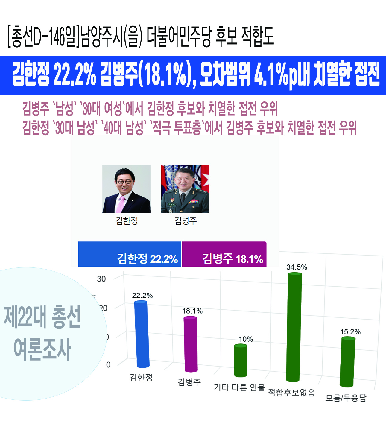 Á¶»ç±â°ü ¿©·ÐÁ¶»ç²É°¡ 11¿ù 15ÀÏ¿¡¼ 16ÀϱîÁö ÀÌÆ²°£ ½Ç½ÃÇÏ¿© 20ÀÏ ¹ßÇ¥ÇÑ ¡¸´õºÒ¾î¹ÎÁÖ´ç Èĺ¸ ÀûÇÕµµ¡¹Á¶»ç¿¡¼ ±èÇÑÁ¤ Çö ±¹È¸ÀÇ¿ø´Â 22.2%, ±èº´ÁÖ Çö ±¹È¸ÀÇ¿ø´Â 18.1%·Î ÀÀ´äµÇ¾úÀ¸¸ç, ¡¸ÀûÇÕÈĺ¸¾øÀ½¡¹34.5%,¡¸¸ð¸§/¹«ÀÀ´ä¡¹15.2%,¡¸±âŸ ´Ù¸¥ Àι°¡¹10%ÀÇ ÀÀ´äµµ ±â·ÏµÇ¾ú´Ù. ÇÑÆí ¡¸ÀûÇÕÈĺ¸¾øÀ½¡¹34.5%,¡¸¸ð¸§/¹«ÀÀ´ä¡¹15.2%,¡¸±âŸ ´Ù¸¥ Àι°¡¹10%ÀÇ ÀÀ´äµµ ±â·ÏµÇ¾ú´Ù.