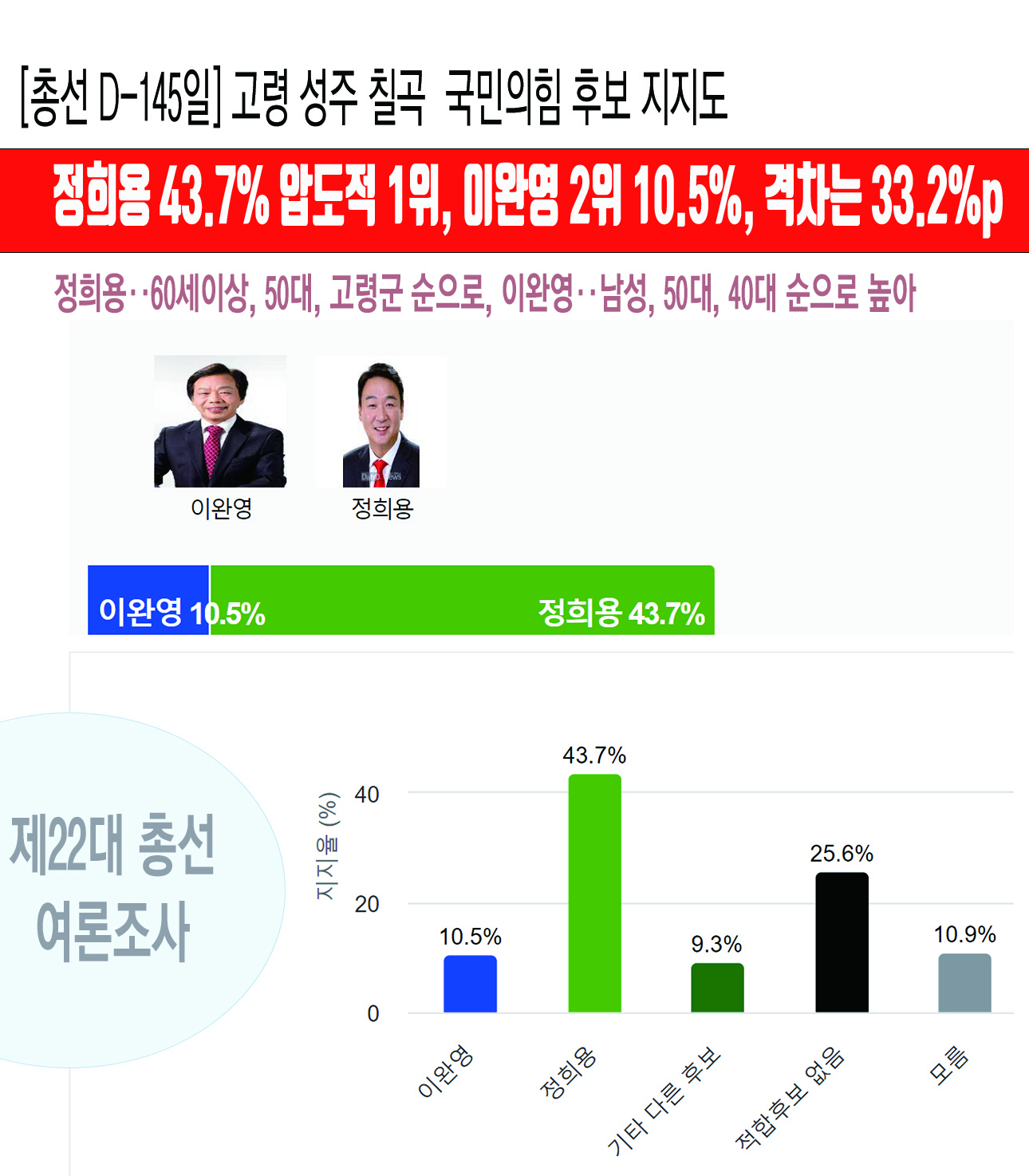 [ÃѼ± D-145ÀÏ] °í·É ¼ºÁÖ Ä¥°î ±¹È¸ÀÇ¿ø¡¤¡¤¡¤Á¤Èñ¿ë 43.7% ¾ÐµµÀû 1À§, À̿Ͽµ 10.5%, °ÝÂ÷´Â 33.2%p