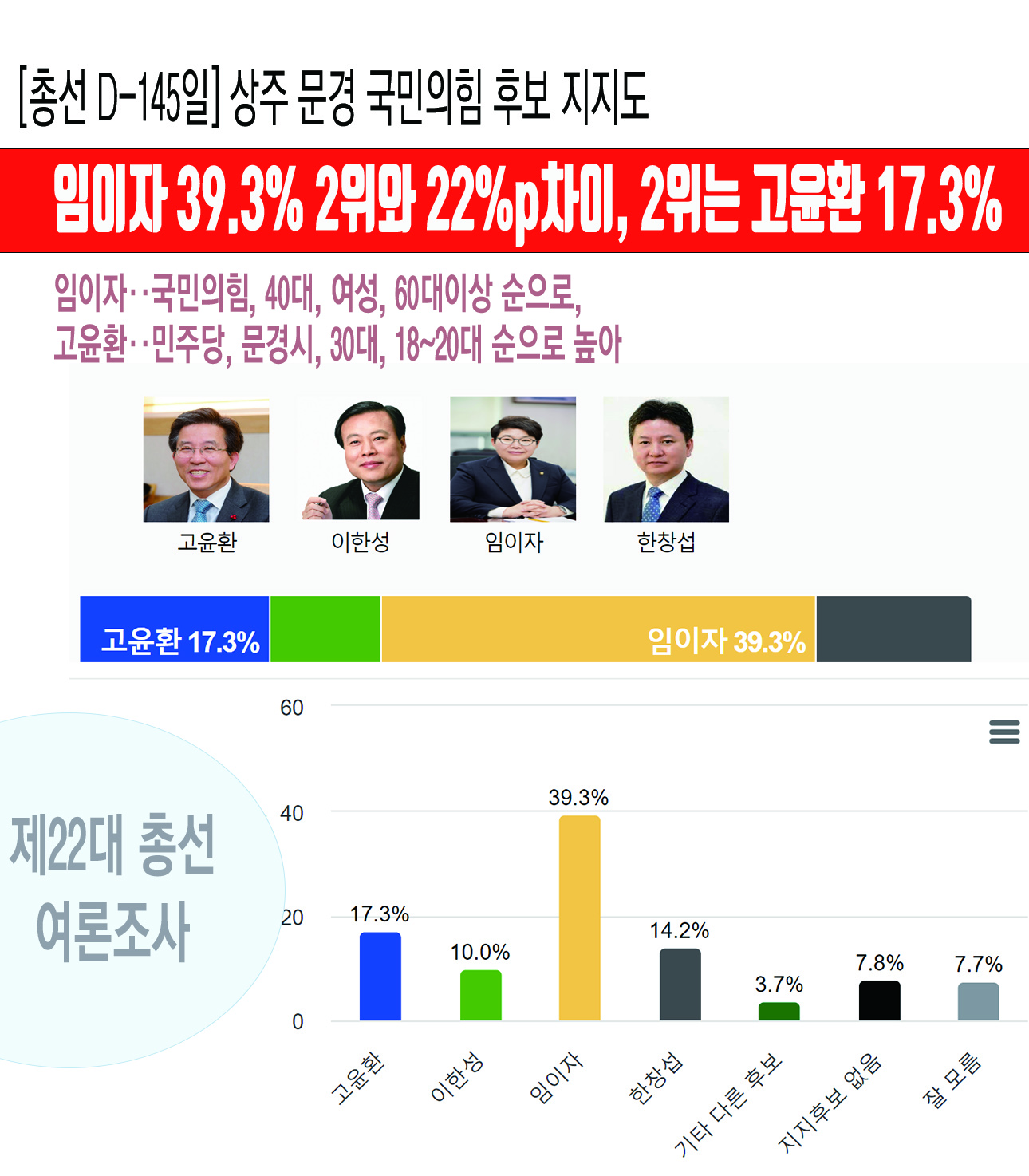 [ÃѼ± D-145ÀÏ] »óÁÖ ¹®°æ ±¹È¸ÀÇ¿ø¡¤¡¤¡¤ÀÓÀÌÀÚ 39.3% 2À§¿Í 22%pÂ÷ÀÌ, 2À§´Â °íÀ±È¯ 17.3%