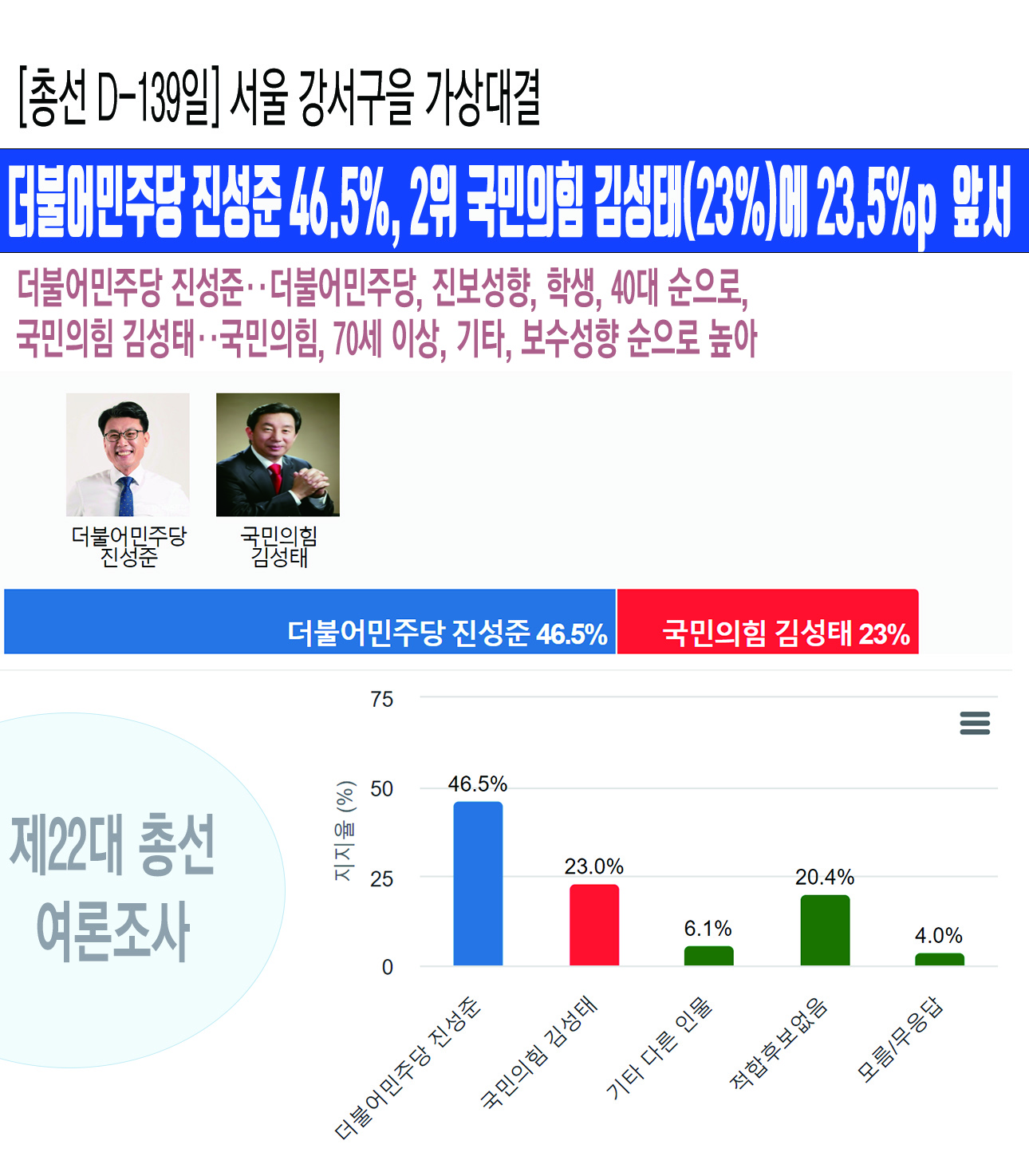 ³»³â Á¦22´ë ±¹È¸ÀÇ¿ø ¼±°Å¸¦ 139ÀÏ ¾ÕµÎ°í Á¶»çµÈ ¼¿ïƯº°½Ã °¼±¸ À» ¼±°Å±¸ ¡¸±è¼ºÅ vs Áø¼ºÁØ °¡»ó´ë°á¡¹Àº ´õºÒ¾î¹ÎÁÖ´ç Áø¼ºÁØ Çö ±¹È¸ÀÇ¿øÀÌ 46.5%¸¦ ¾ò¾î 23%¸¦ ¾òÀº ±¹¹ÎÀÇÈû ±è¼ºÅ Àü ±¹È¸ÀÇ¿ø¸¦ 23.5%pÀÇ Å« Â÷ÀÌ·Î ¾Õ¼ ³ª°¡´Â °ÍÀ¸·Î ³ª¿Ô´Ù.
