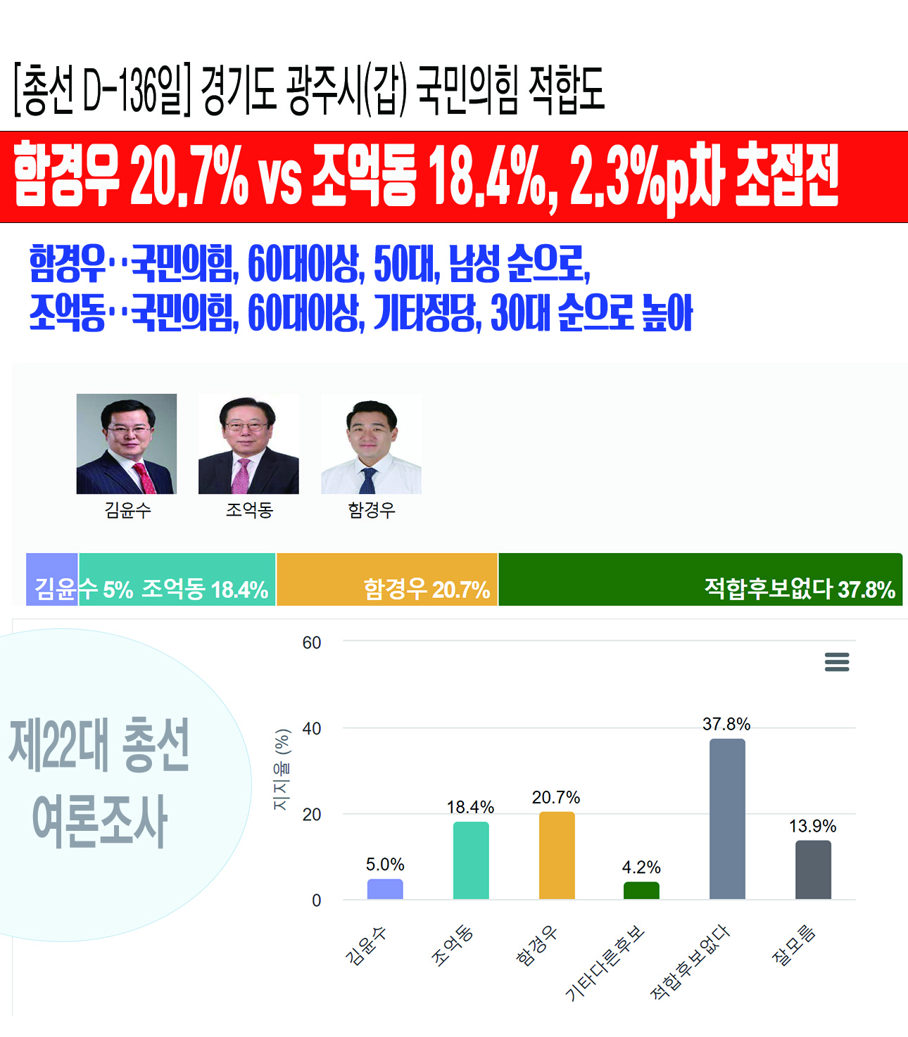 ³»³â Á¦22´ë ±¹È¸ÀÇ¿ø ¼±°Å¸¦ 136ÀÏ ¾ÕµÎ°í Á¶»çµÈ °æ±âµµ ±¤Áֽð© ¼±°Å±¸ ¡¸±¹¹ÎÀÇÈû Èĺ¸ ÀûÇÕµµ¡¹¿©·ÐÁ¶»ç¿¡¼ ÇÔ°æ¿ì Çö °æ±â±¤ÁÖ°© ´çÇùÀ§¿øÀåÀÌ 20.7%¸¦ ¾ò¾î 18.4%¸¦ ¾òÀº Á¶¾ïµ¿ Àü ±¤ÁÖ½ÃÀå¿Í 2.3%p Â÷ÀÌ·Î ÃÊ ¹ÚºùÀÇ Á¢ÀüÀ» ¹úÀÌ´Â °ÍÀ¸·Î ³ªÅ¸³µ´Ù.