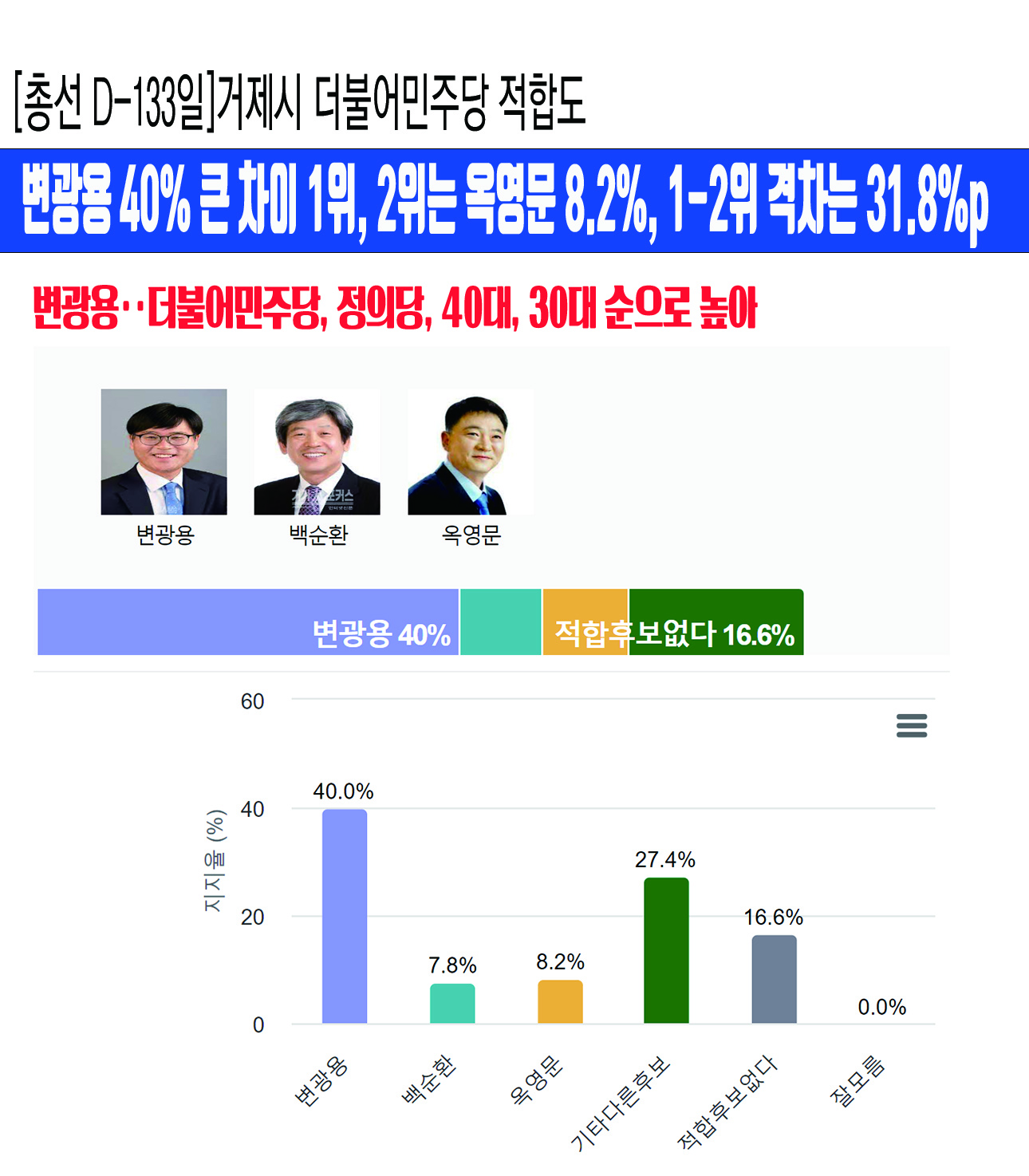 ³»³â Á¦22´ë ±¹È¸ÀÇ¿ø ¼±°Å¸¦ 133ÀÏ ¾ÕµÎ°í Á¶»çµÈ °æ»ó³²µµ °ÅÁ¦½Ã ¼±°Å±¸ ¡¸´õºÒ¾î¹ÎÁÖ´ç Èĺ¸ ÀûÇÕµµ¡¹´Â º¯±¤¿ë Àü °ÅÁ¦½ÃÀåÀÌ 40%¸¦ ¾ò¾î 8.2%¸¦ ¾òÀº ¿Á¿µ¹® Àü °ÅÁ¦½ÃÀÇȸ ÀÇÀ带 31.8%pÀÇ Å« Â÷ÀÌ·Î ¾Õ¼ ³ª°¡´Â °ÍÀ¸·Î ³ª¿Ô´Ù.
