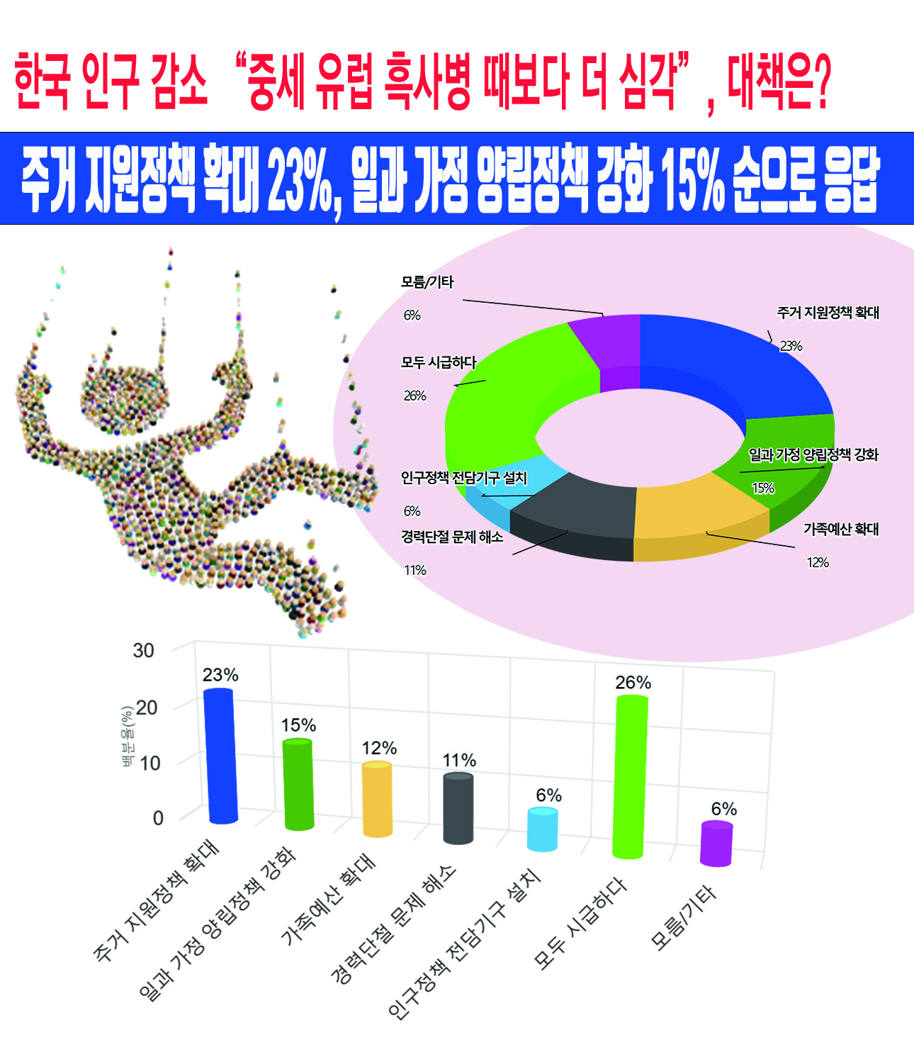 Á¶»ç±â°ü ¸®¼Ä¡ºä°¡ 11¿ù 28ÀÏ¿¡¼ 30ÀϱîÁö »çÈê°£ ½Ç½ÃÇÏ¿© 3ÀÏ ¹ßÇ¥ÇÑ ¡¸Àα¸¼Ò¸ê À§±â ½Ã±ÞÇÑ ´ëÃ¥¡¹À» ¹¯´Â Á¶»ç¿¡¼ ¡¸ÁÖ°Å Áö¿øÁ¤Ã¥ È®´ë¡¹¶ó´Â ÀÀ´äÀÌ 23%, ¡¸Àϰú °¡Á¤ ¾ç¸³Á¤Ã¥ °È¡¹´Â 15%, ¡¸°¡Á·¿¹»ê È®´ë¡¹´Â 12%, ¡¸°æ·Â´ÜÀý ¹®Á¦ ÇØ¼Ò¡¹´Â 11%, ¡¸Àα¸Á¤Ã¥ Àü´ã±â±¸ ¼³Ä¡¡¹´Â 6%·Î ÀÀ´äµÇ¾úÀ¸¸ç, À§ ¡¸¸ðµç Á¤Ã¥ÀÌ ½Ã±ÞÇÏ´Ù¡¹ 26%, ¡¸¸ð¸§/±âŸ¡¹ÀÀ´äÀº 6%·Î ±â·ÏµÇ¾ú´Ù.