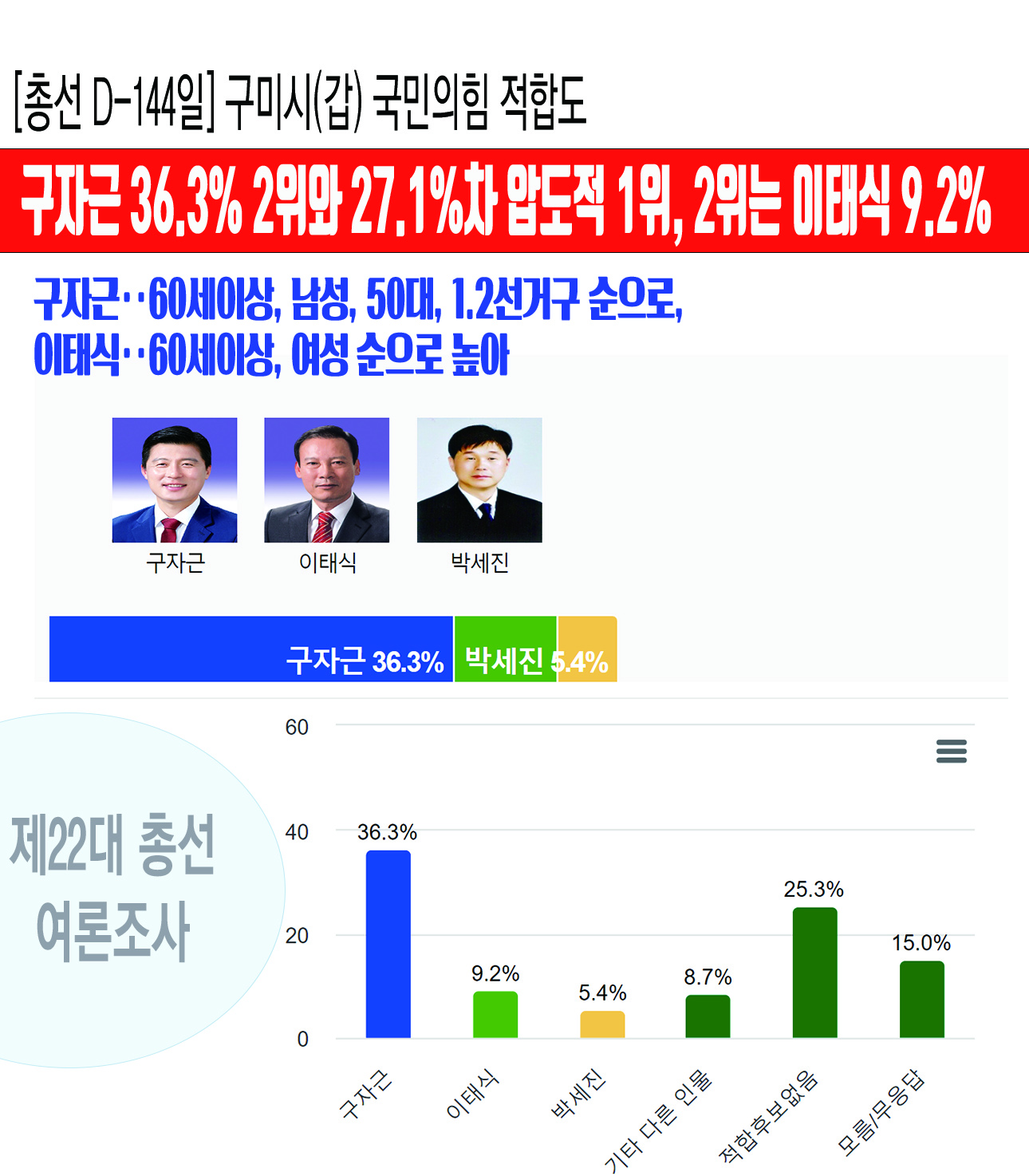 [ÃѼ± D-144ÀÏ]±¸¹Ì½Ã(°©) ±¹¹ÎÀÇÈû ÀûÇÕµµ¡¤¡¤¡¤±¸ÀÚ±Ù 36.3% 2À§¿Í 27.1%Â÷ ¾ÐµµÀû 1À§, 2À§´Â ÀÌÅÂ½Ä 9.2%