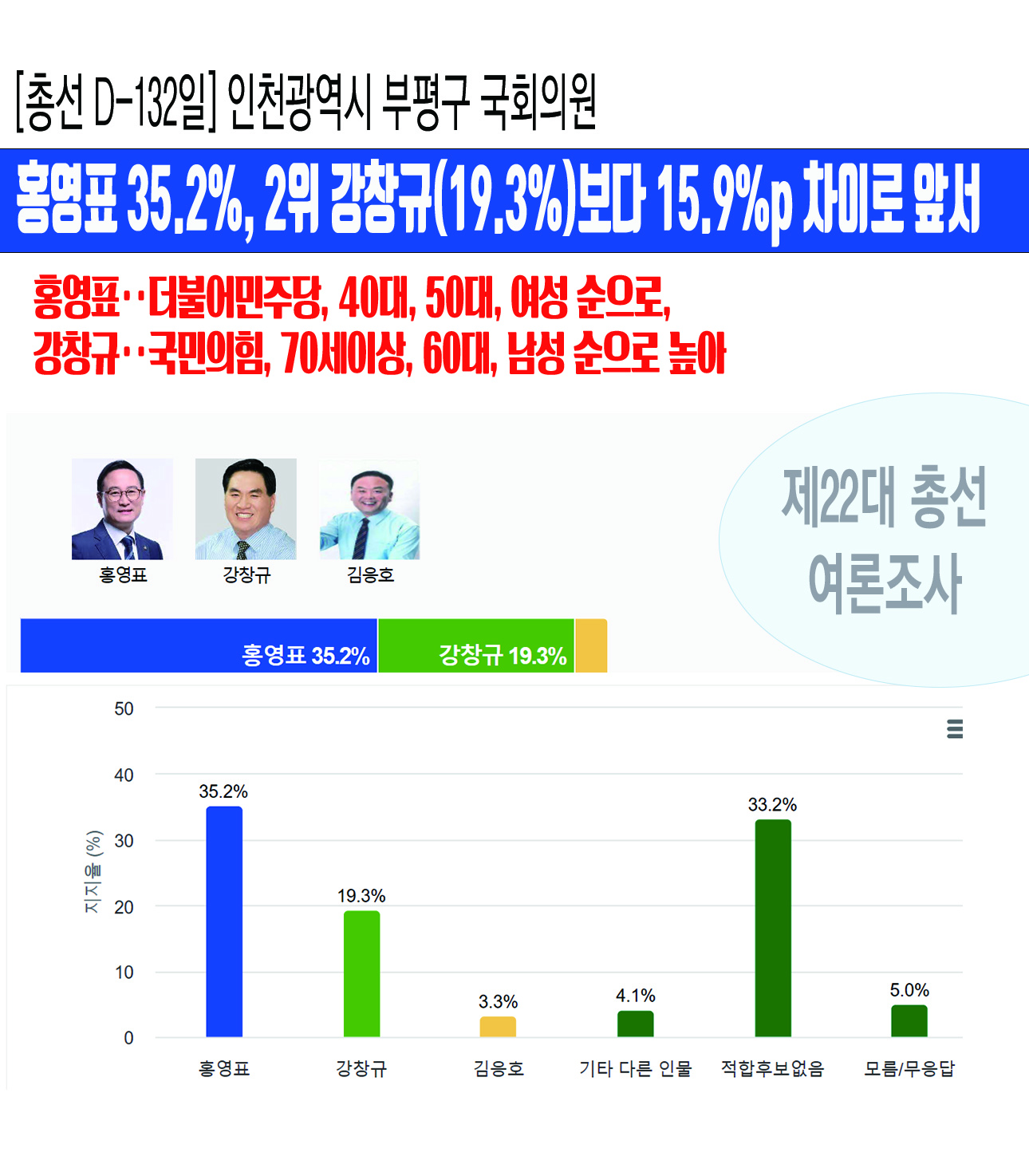 [ÃѼ± D-132ÀÏ] ÀÎõ±¤¿ª½Ã ºÎÆò±¸ ±¹È¸ÀÇ¿ø¡¤¡¤¡¤È«¿µÇ¥ 35.2%, 2À§ °Ã¢±Ô(19.3%)º¸´Ù 15.9%p Â÷ÀÌ·Î ¾Õ¼