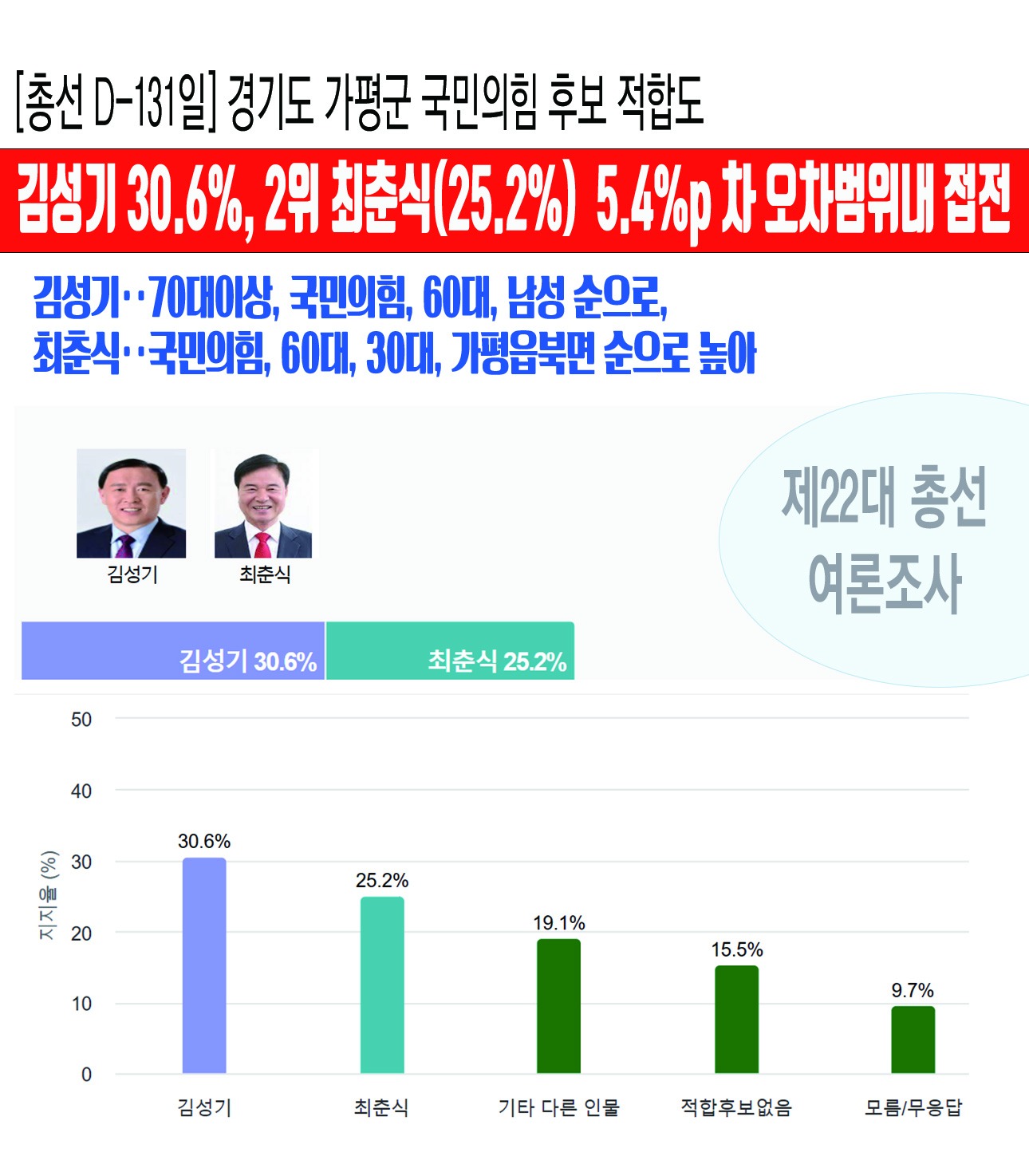 [ÃѼ± D-131ÀÏ] °æ±âµµ °¡Æò±º ±¹¹ÎÀÇÈû Èĺ¸ ÀûÇÕµµ¡¤¡¤¡¤±è¼º±â 30.6%, 2À§ ÃÖÃá½Ä(25.2%) 5.4%p Â÷ ¿ÀÂ÷¹üÀ§³» Á¢Àü